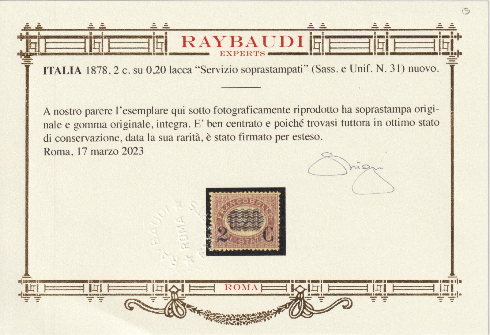 / ITALIA REGNO 1878 2c. su 0,20 lacca SERVIZIO SOVRASTAMPATO M.N.H. CERT. RAYBAUDI