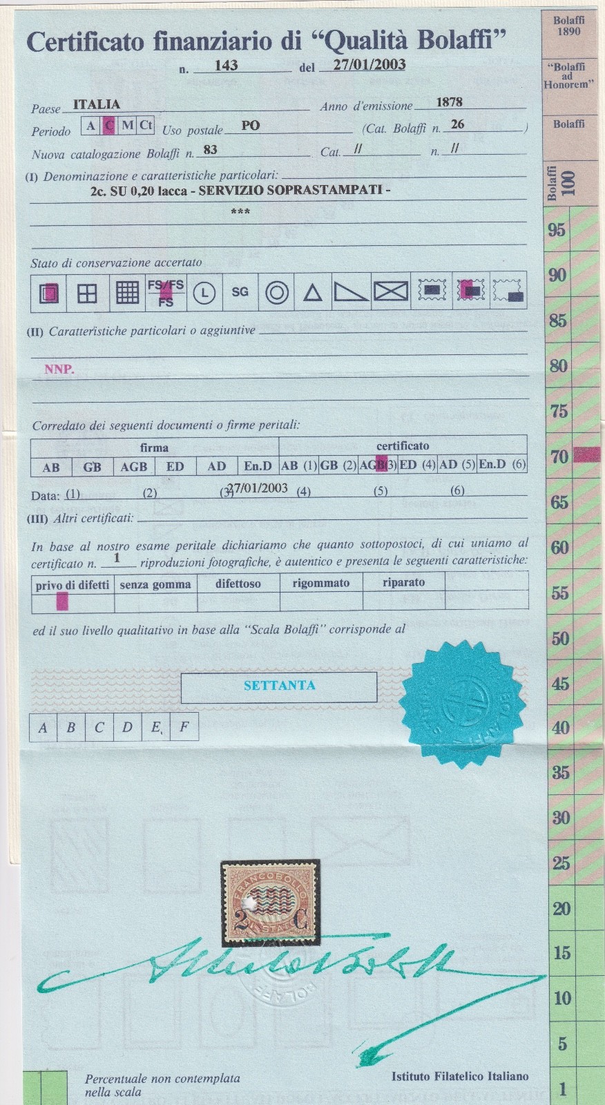 ITALIA REGNO 1878 2c. su 0,20 lacca SERVIZIO SOVRASTAMPATO M.N.H. CERT. RAYBAUDI quantità