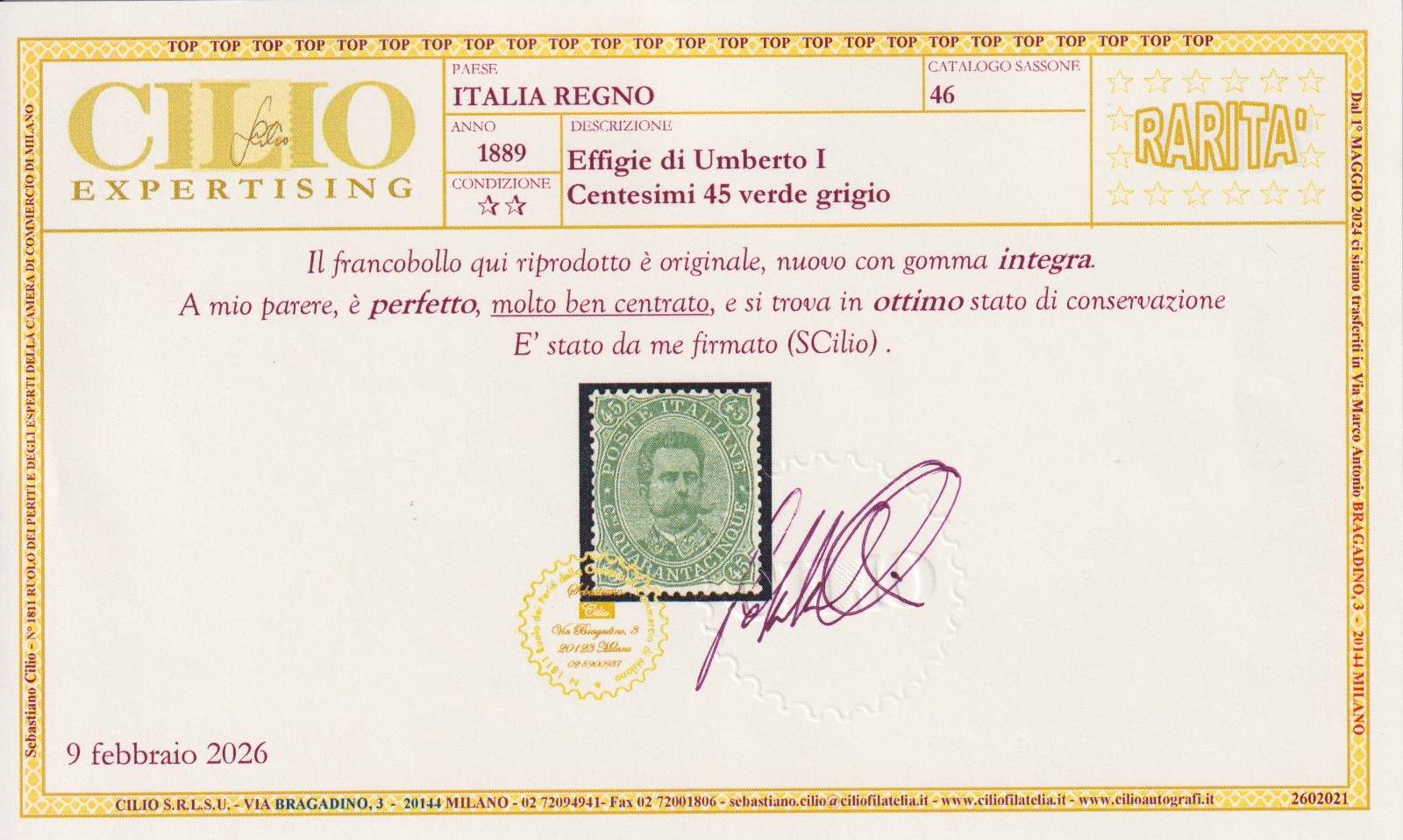 ITALIA REGNO 1889 45 CENT. EFFIGIE UMBERTO I M.N.H. CERT. CILIO quantità