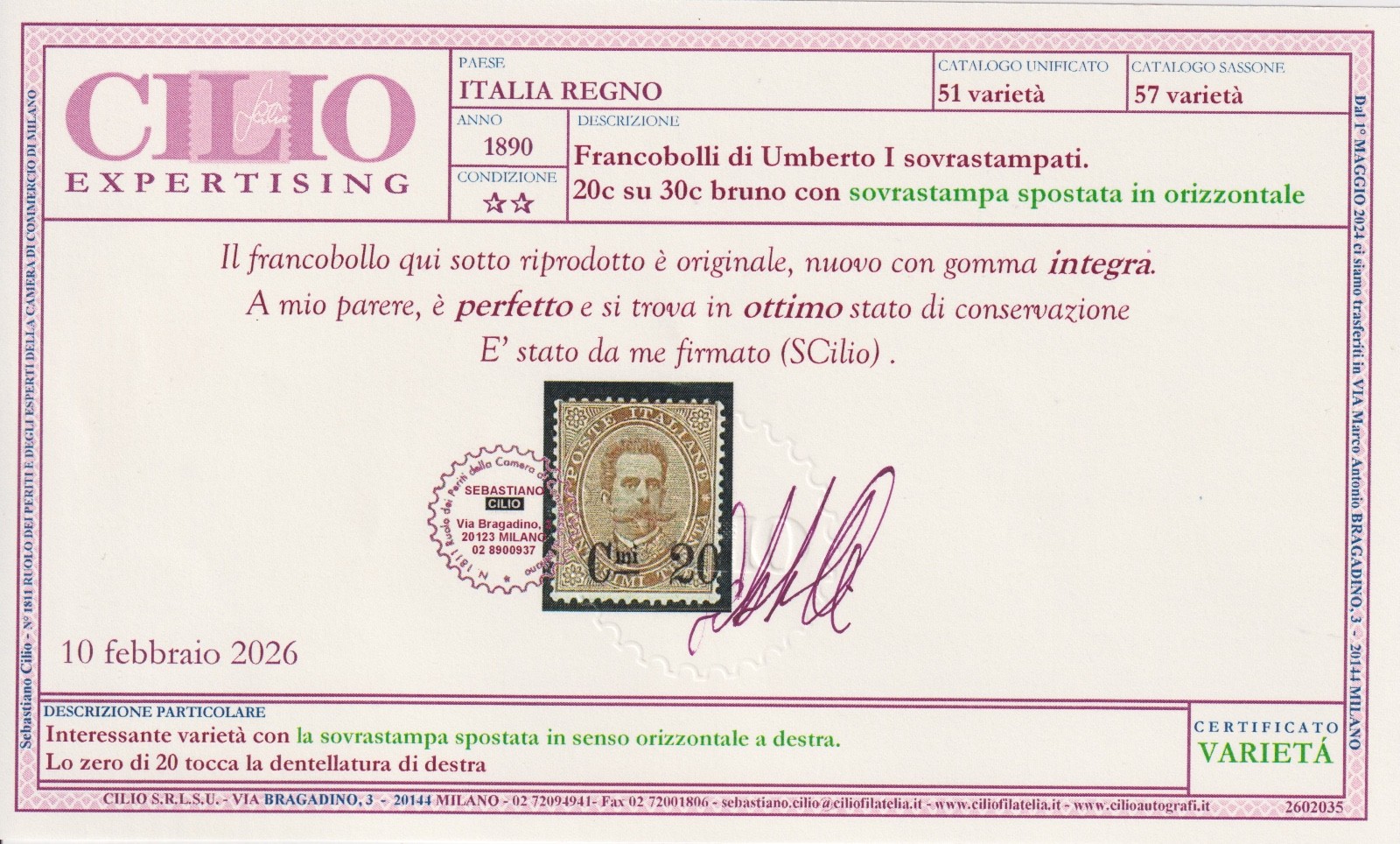 ITALIA REGNO 1890 UMBERTO I SOVRASTAMPATO M.N.H. CERT. CILIO quantità