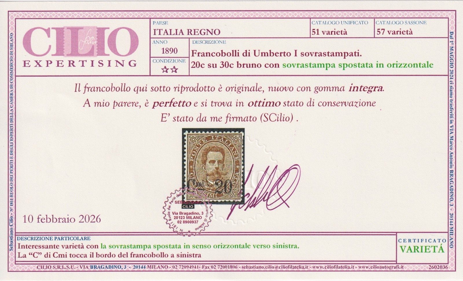 ITALIA REGNO 1890 UMBERTO I SOVRASTAMPATO M.N.H. CERT. CILIO quantità
