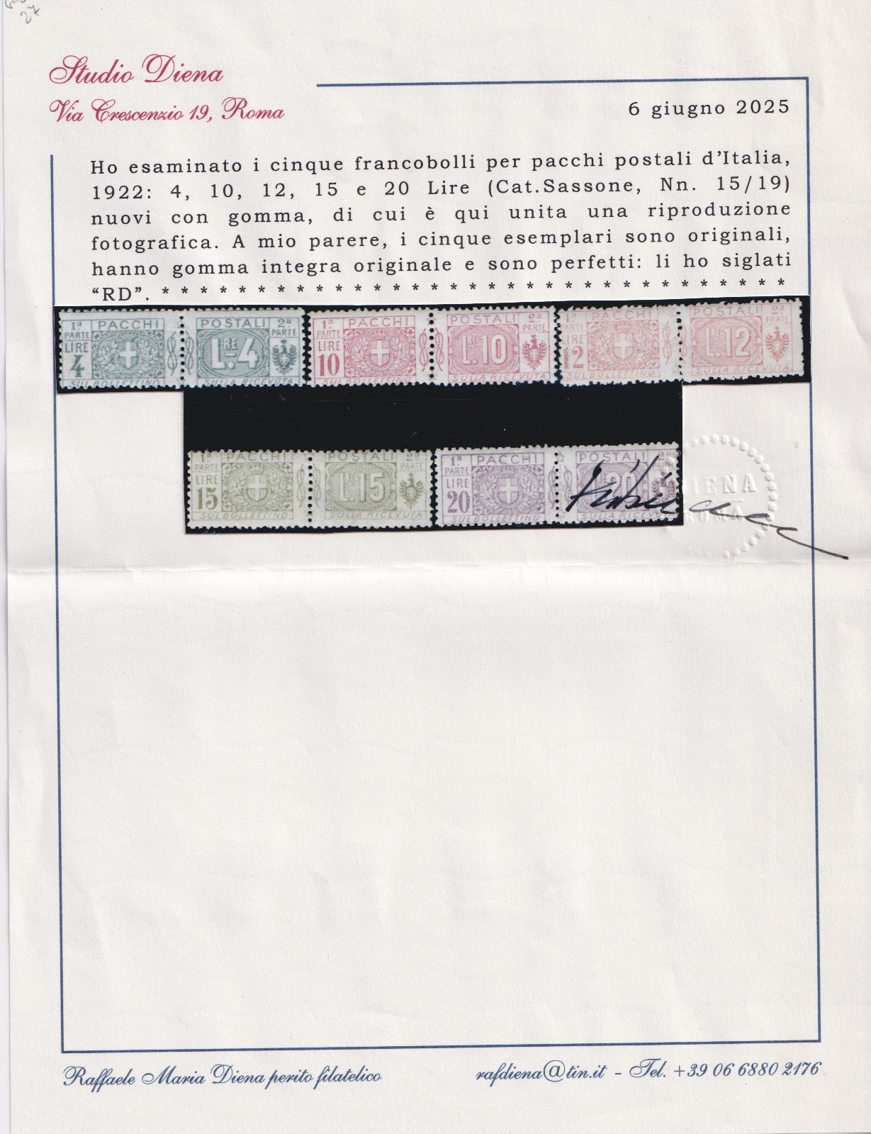 Italia Regno 1922 Pacchi "Nodo Savoia" (N°7/19) Cert. DIENA MNH quantità