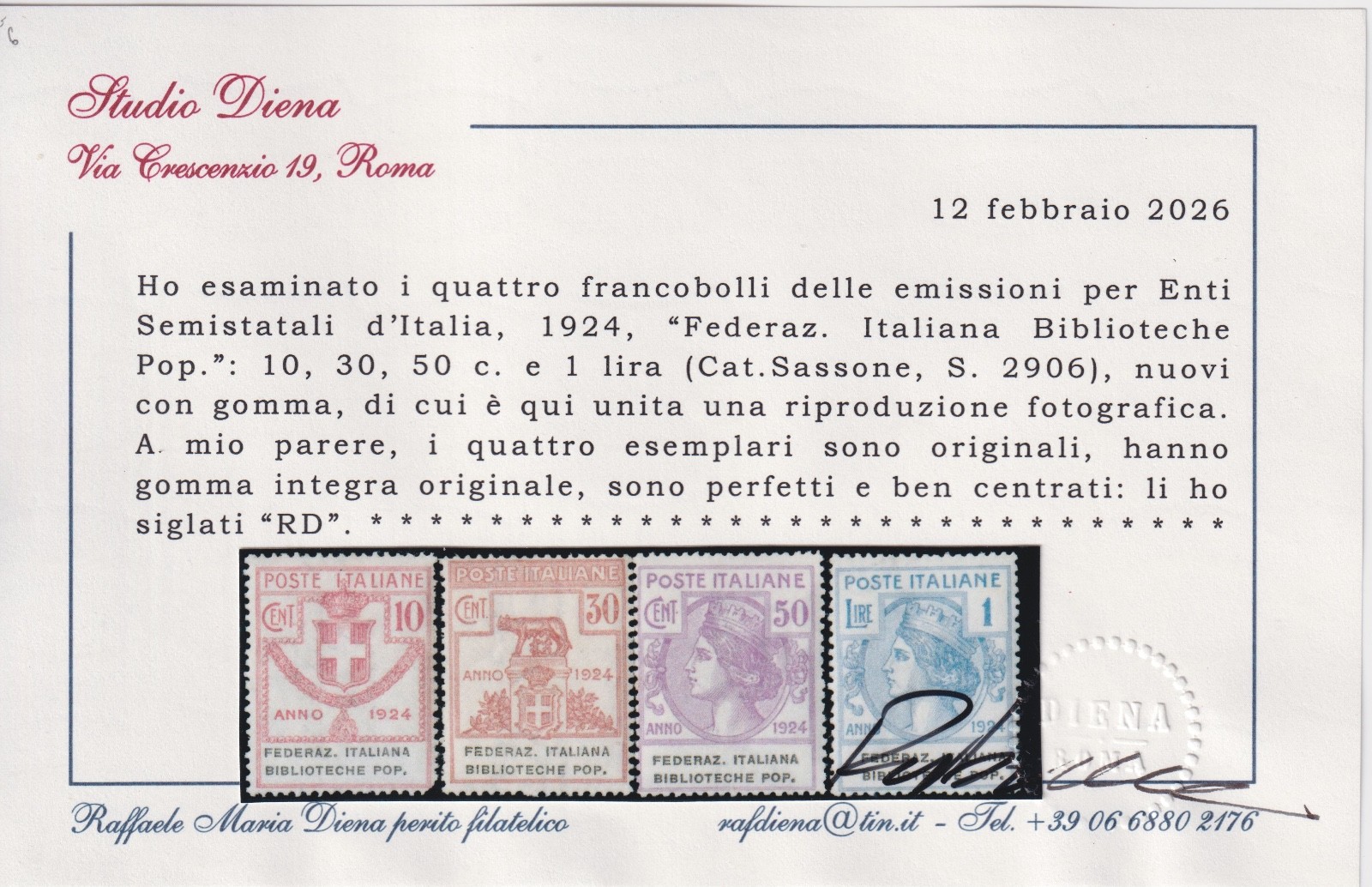 ITALIA REGNO 1924 FEDERAZ. ITALIANA BIBLIOTECHE POP. MNH CERTIFICATO DIENA quantità