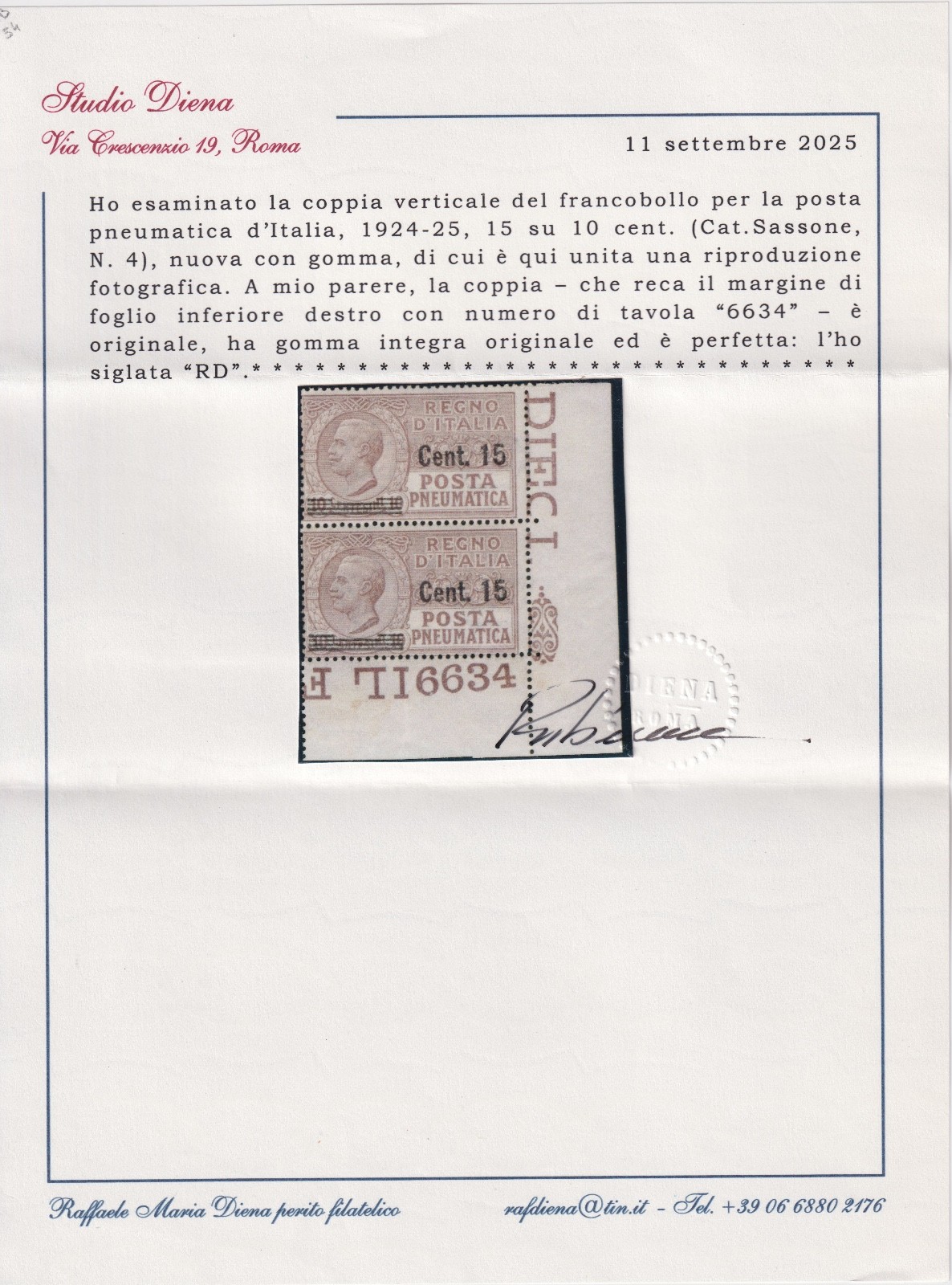 ITALIA REGNO 1924 POSTA PNEUMATICA MNH CON NUMERO DI TAVOLA CERT. DIENA