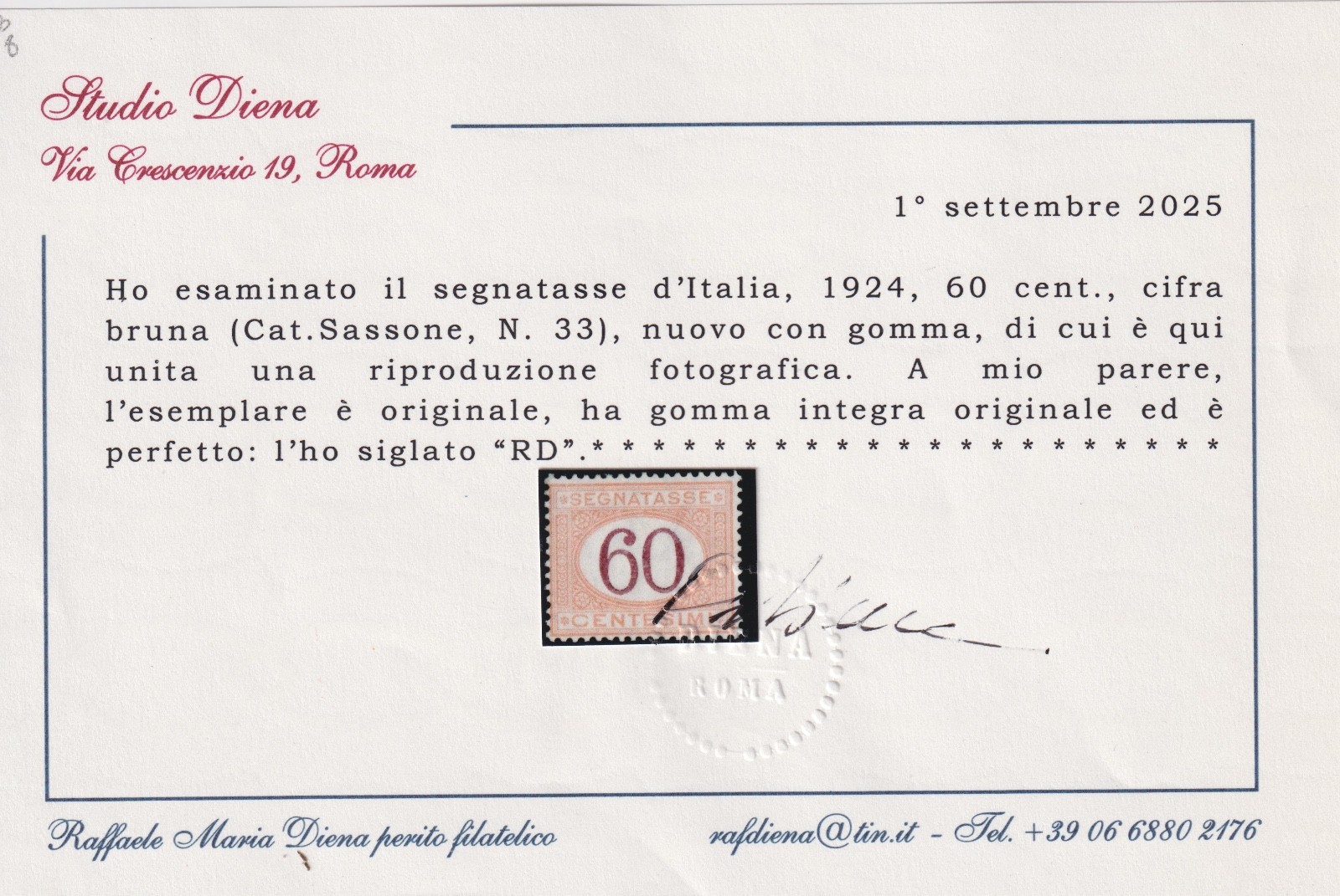 / ITALIA REGNO 1924/ SEGNATASSE – 60 C. CIFRA BRUNA MNH CERTIFICATO DIENA