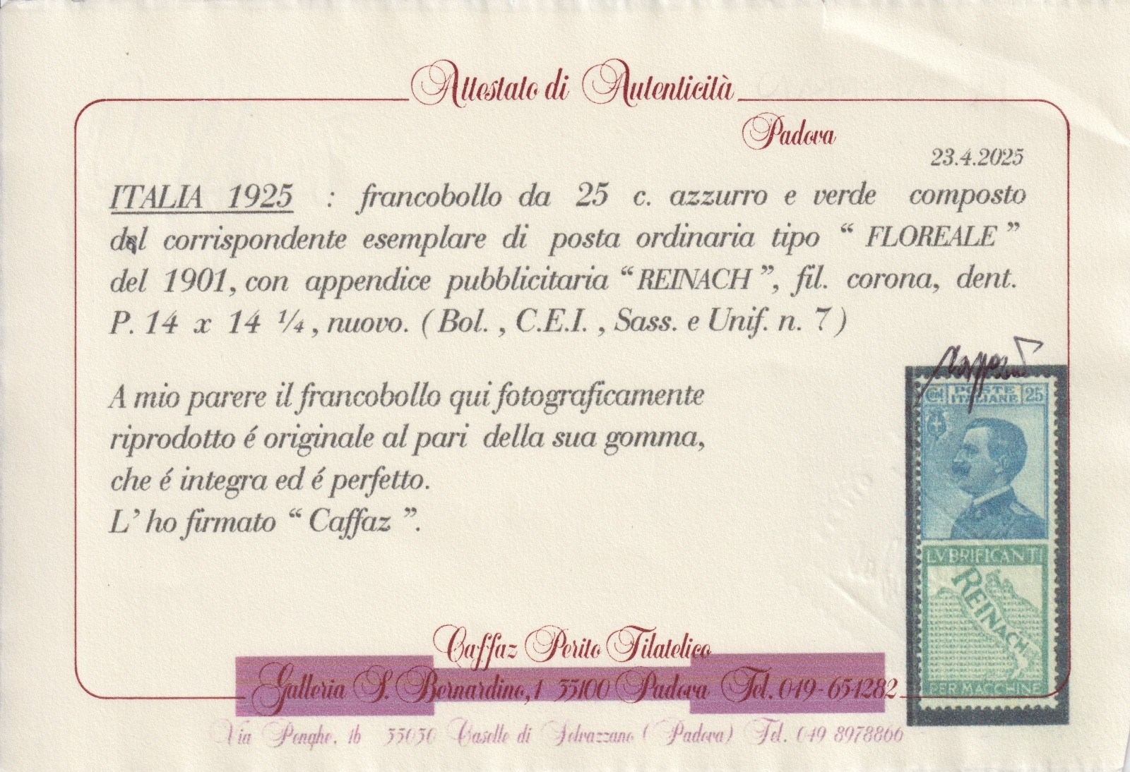 / ITALIA REGNO 1925 FRANCOBOLLI PER PUBBLICITÀ “FLOREALE” 25 C. MNH CERT. CAFFAZ