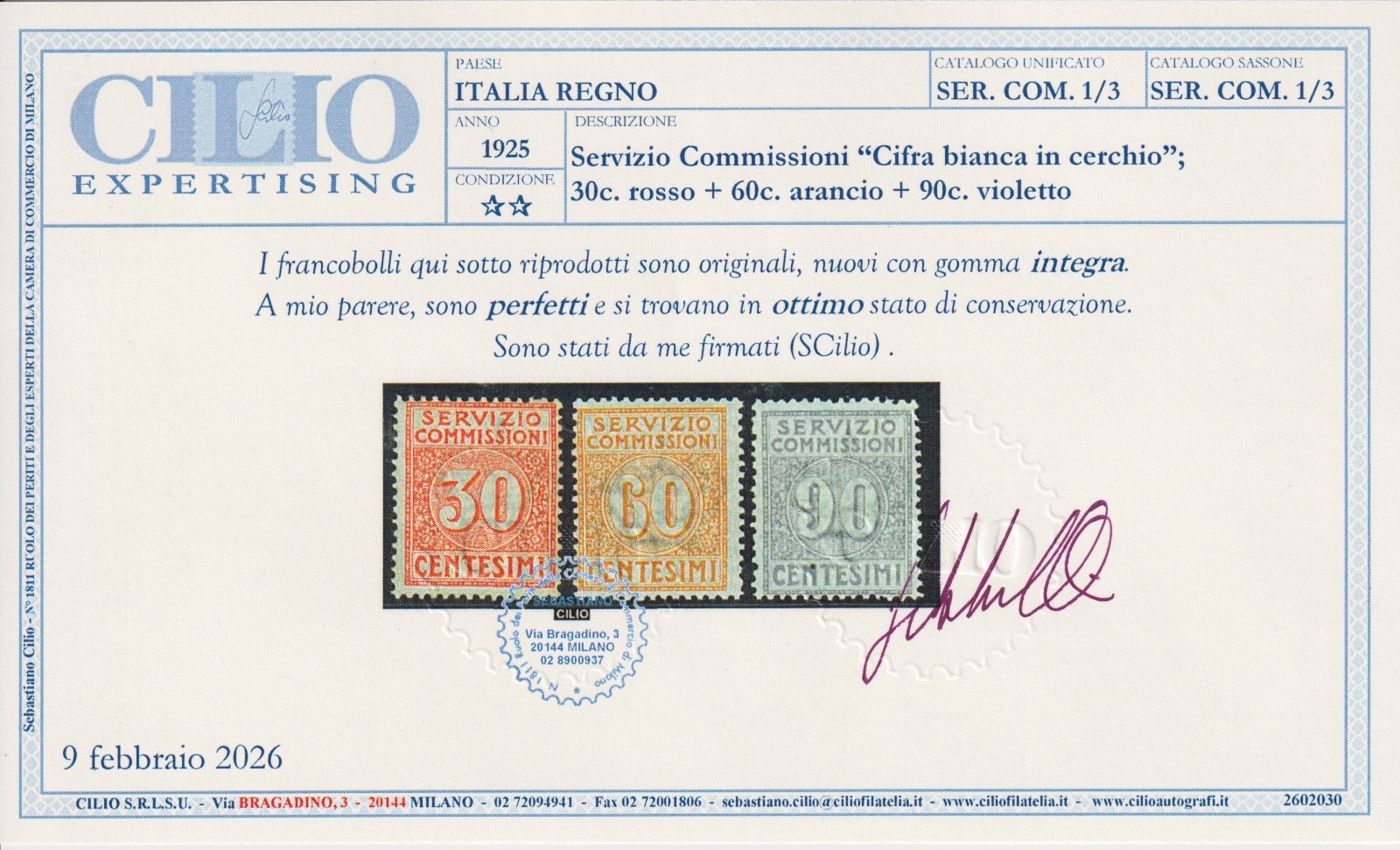 ITALIA REGNO 1925 SERVIZIO COMMISSIONI "Cifra bianca in cerchio" MNH CERT. CILIO quantità