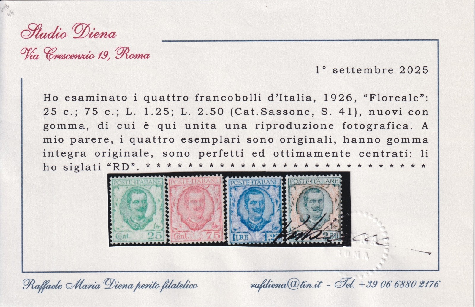ITALIA REGNO 1926 FLOREALE 4 VALORI S.41 MNH CERT. DIENA quantità