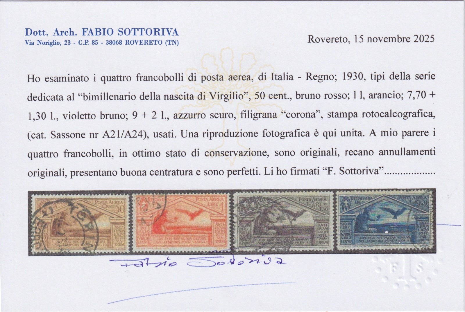 / ITALIA REGNO 1930 Bimillenario di Virgilio P.A. 4 VAL. CERT. SOTTORIVA