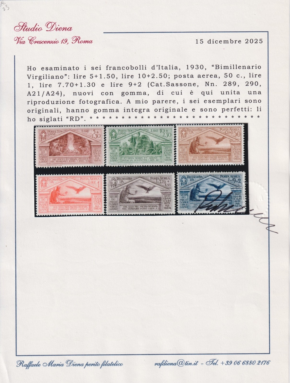 ITALIA REGNO 1930 BIMILLENARIO VIRGILIO 13 VALORI MNH CERTIFICATO DIENA