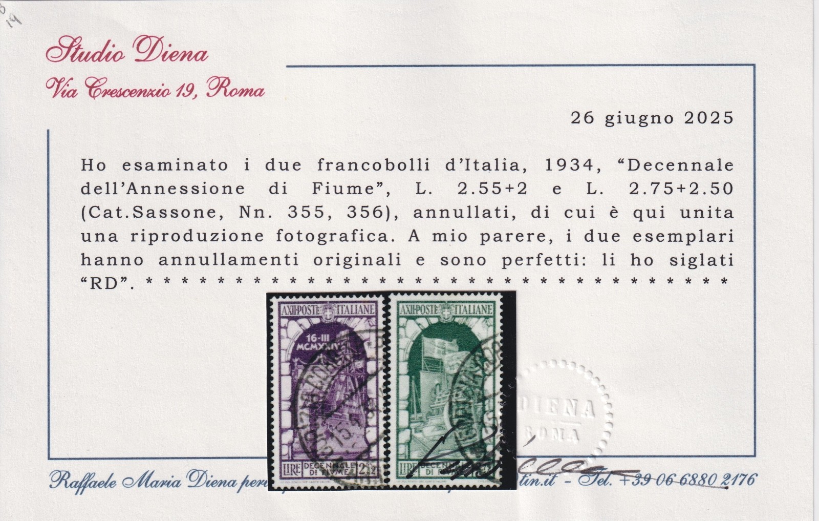 ITALIA REGNO 1934 DECENNALE DELL’ANNESSIONE DI FIUME N.355-356 CERT. DIENA