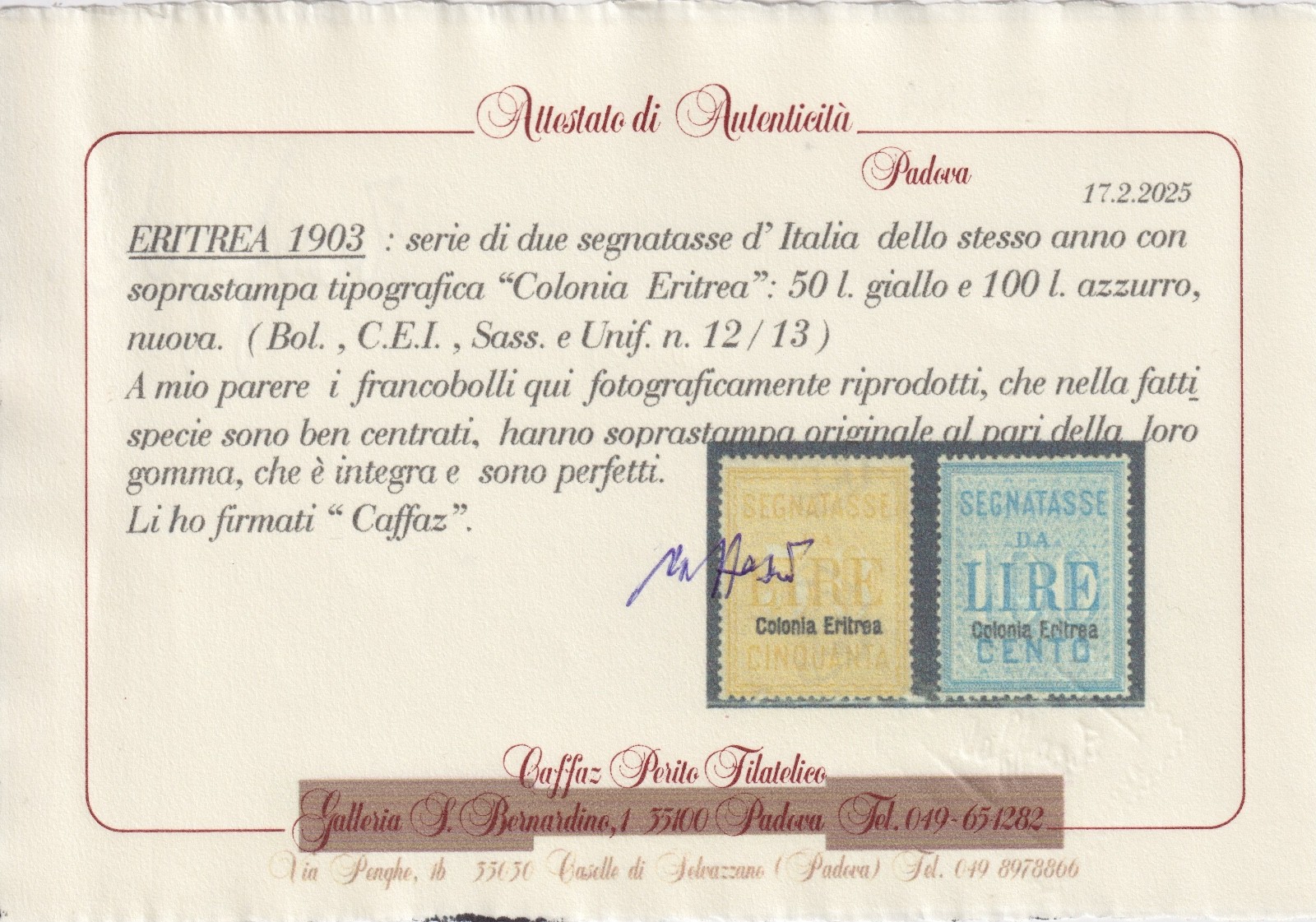 / ITALIA REGNO Colonie Eritrea 1903 serie di 2 segnatasse MNH CERT. CAFFAZ