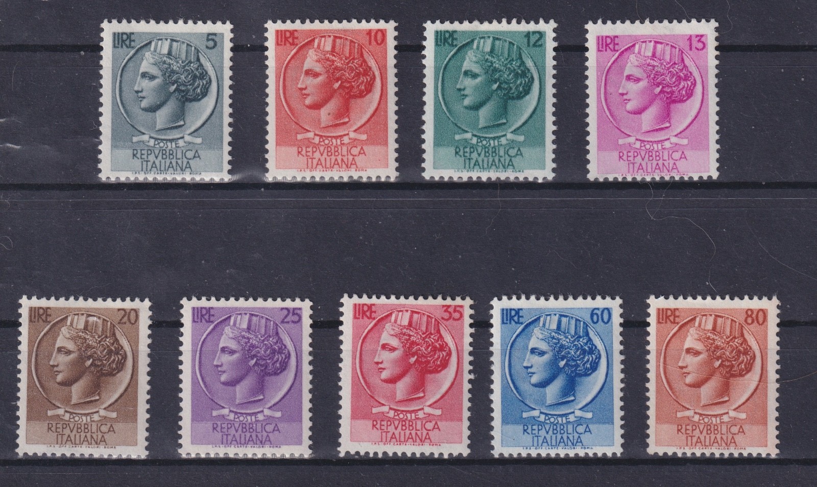 ITALIA REPUBBLICA 1953-54 ITALIA TURRITA 9 VALORI (S. 157) MNH quantità
