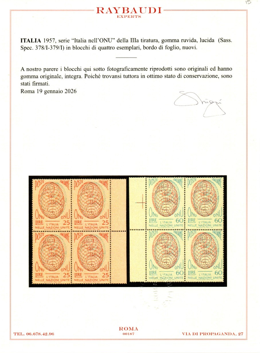 ITALIA REPUBBLICA ONU TERZA TIRATURA 1957 MNH CERT RAYBAUDI quantità