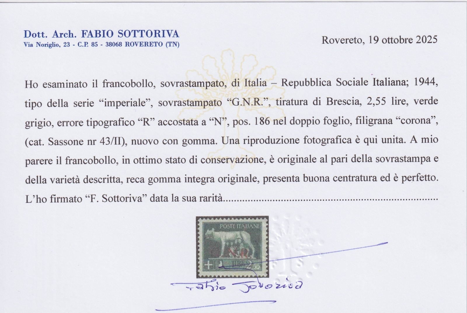 R.S.I. 1944 G.N.R. TIRATURA BRESCIA 2,55 LIRE MNH CERT. SOTTORIVA quantità