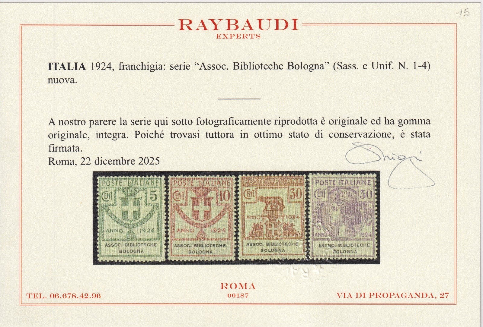 / REGNO 1924 ASSOC. BIBLIOTECHE BOLOGNA MNH CERT. RAYBAUDI