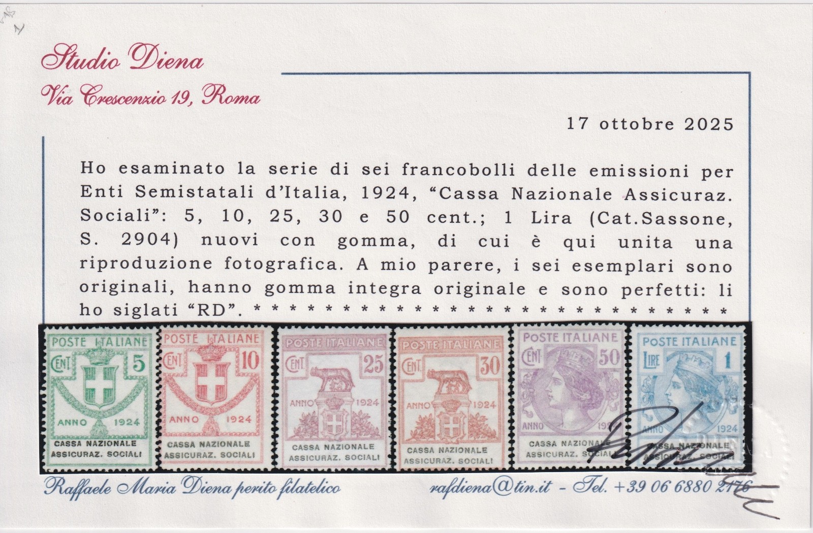REGNO 1924 ENTI SEMISTATALI CASSA NAZIONALE ASSICURAZIONI SOCIALI MNH CERT.DIENA quantità