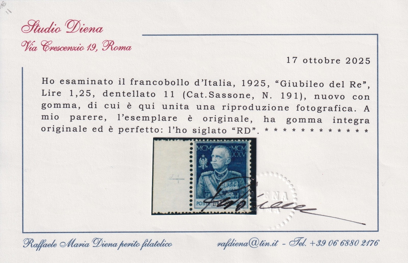 REGNO 1925 GIUBILEO DEL RE 1.25 LIRE DENT. 11 MNH CERTIFICATO DIENA