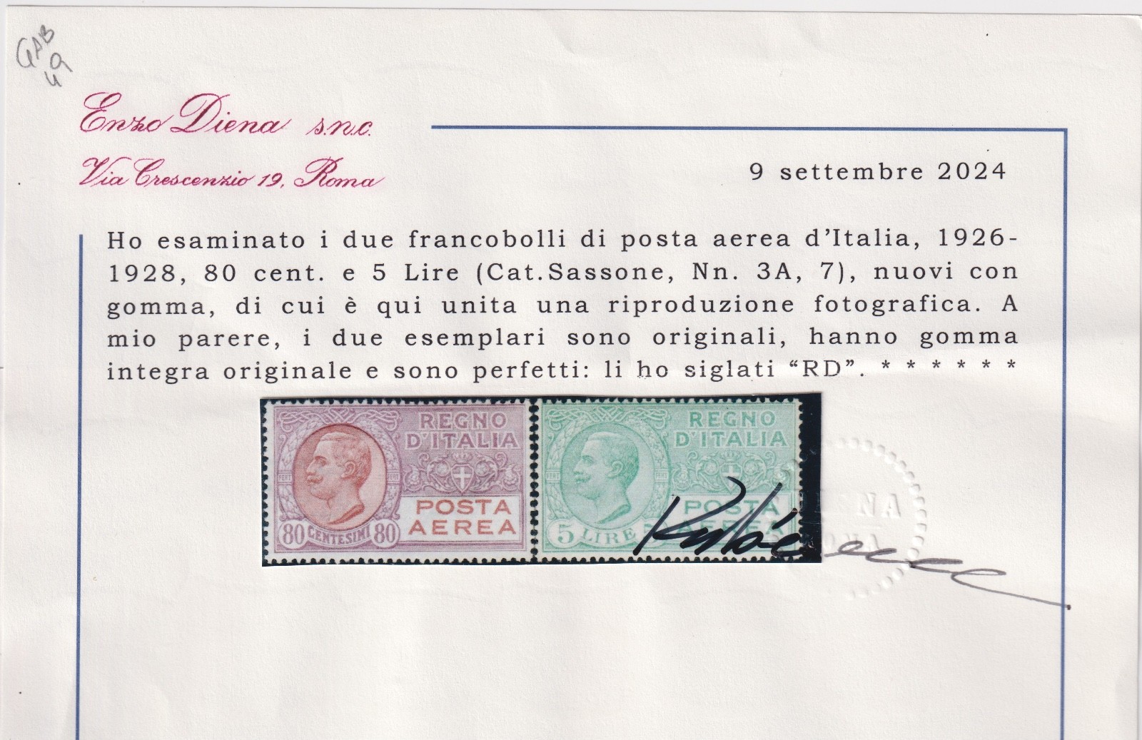 / REGNO 1928 POSTA AEREA MNH CERTIFICATO DIENA 80 cent e 5 lire