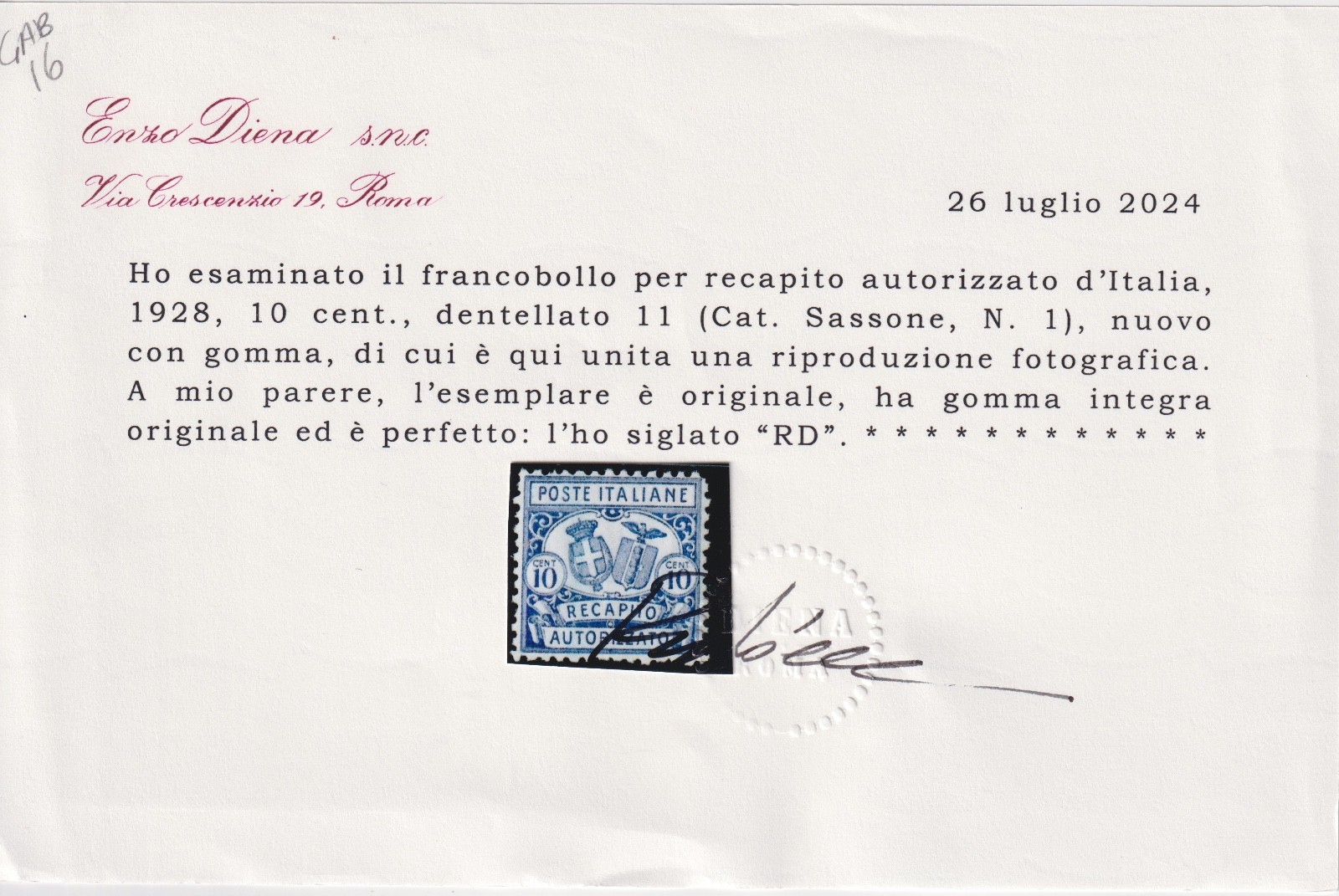 / REGNO 1928 – Stemma d’Italia e fascio RECAPITO AUTORIZZATO MNH CERTIFICATO DIENA