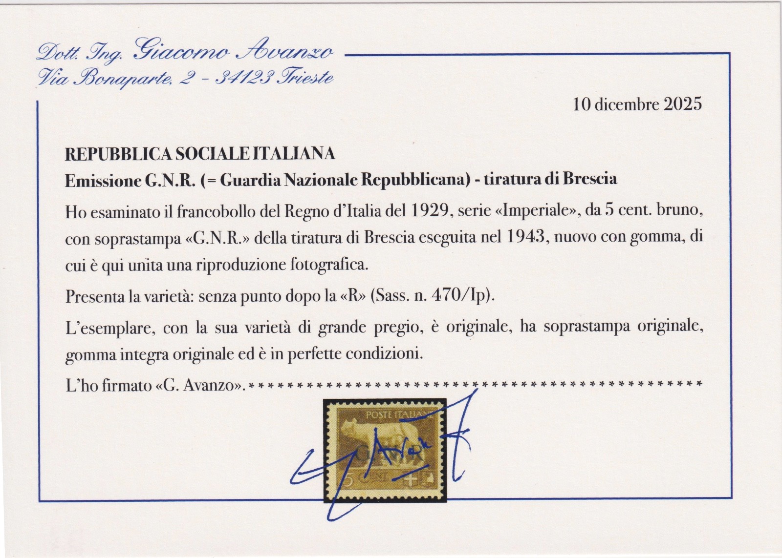 REGNO 1943 G.N.R. TIRATURA BRESCIA 5 CENT. BRUNO MNH CERT. AVANZO RARO quantità