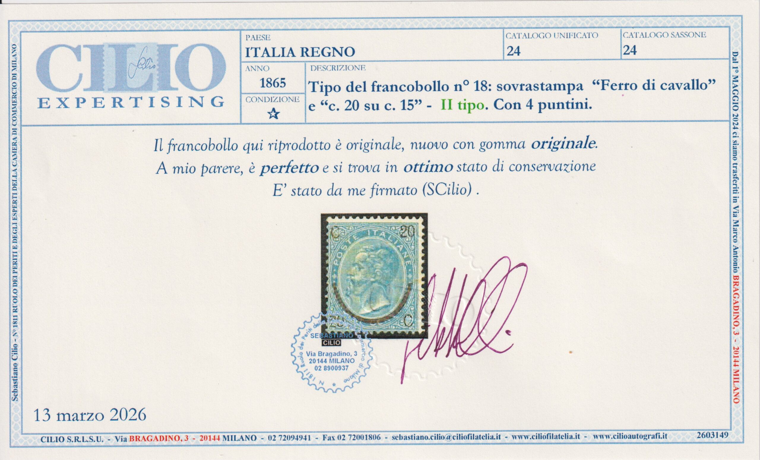 REGNO D’ITALIA 1865 FERRO DI CAVALLO II° TIPO G.O. CERT. CILIO