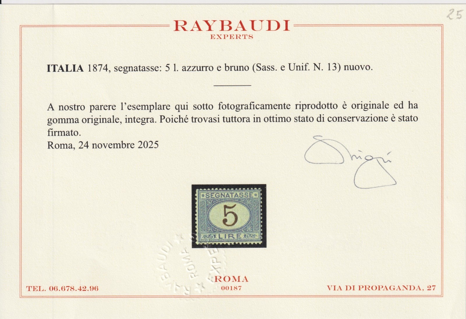 REGNO D’ITALIA 1874 SEGNATASSE 5 LIRE AZZURRO E BRUNO MNH CERT. RAYBAUDI