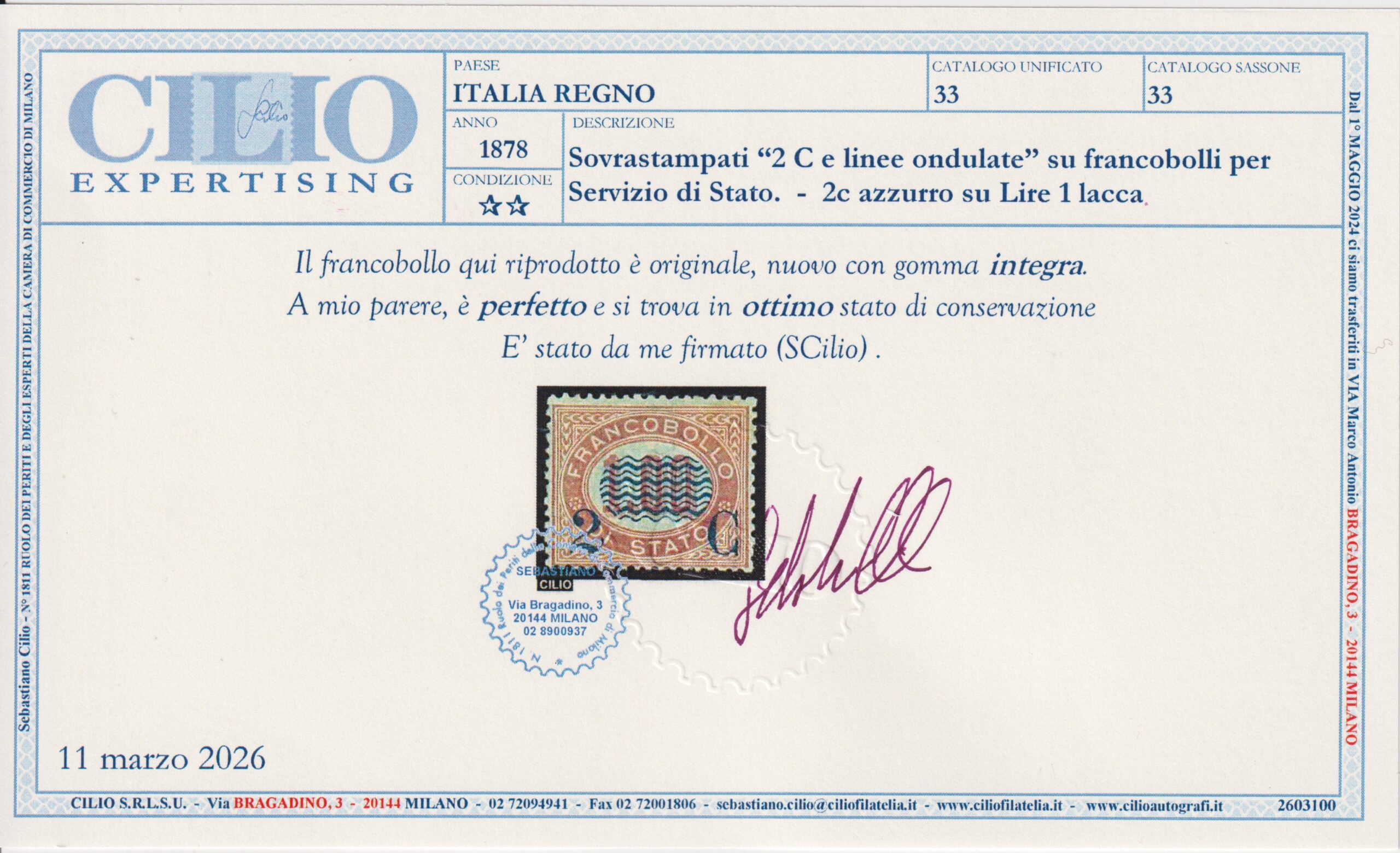 Regno servizio di Stato 1878 sovrastampato 2C su 0,30 MNH certificato Sottoriva