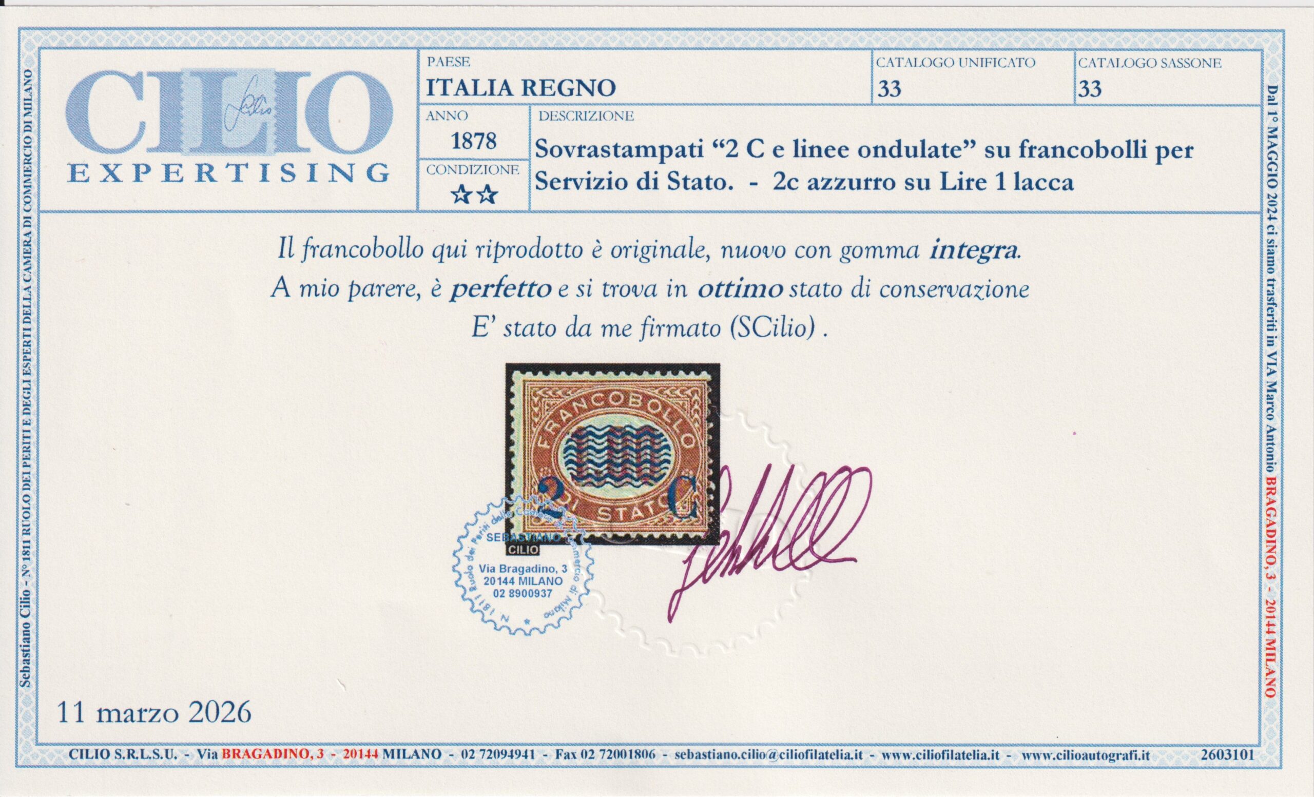 REGNO D’ITALIA 1878 ONDULINE 2c su Lire 1 M.N.H. CERT. CILIO