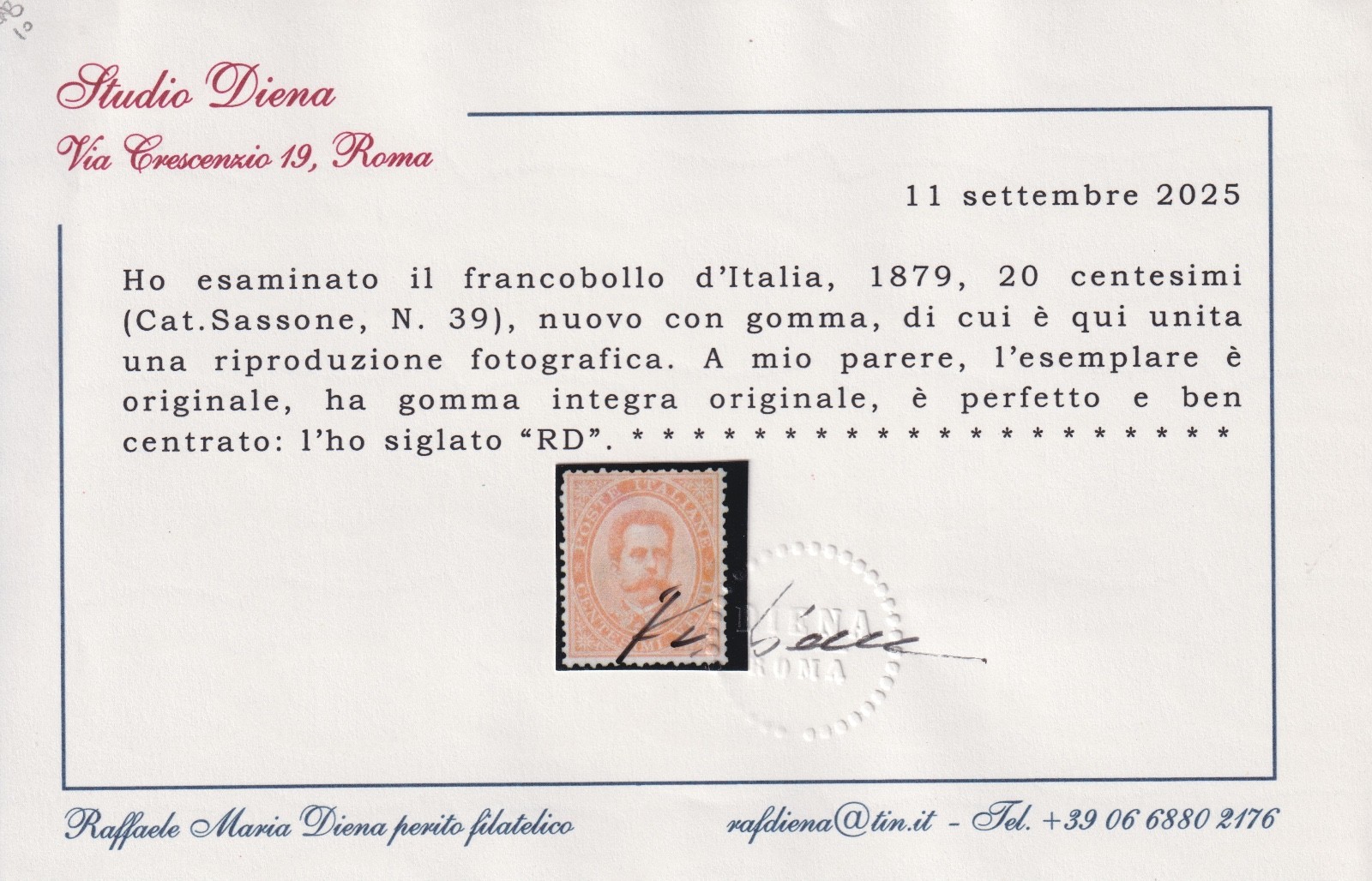 REGNO D’ITALIA 1879 UMBERTO I 20 CENTESIMI N.39 MNH CERTIFICATO DIENA