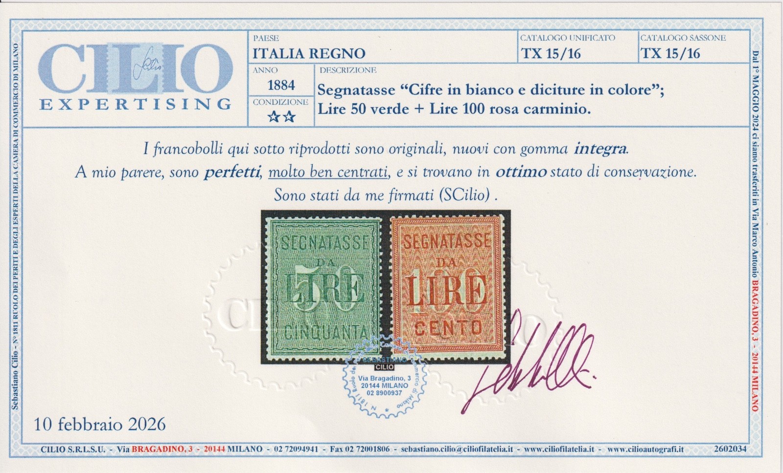 REGNO D'ITALIA 1884 SEGNATASSE 2 VALORI M.N.H. CERT. CILIO quantità