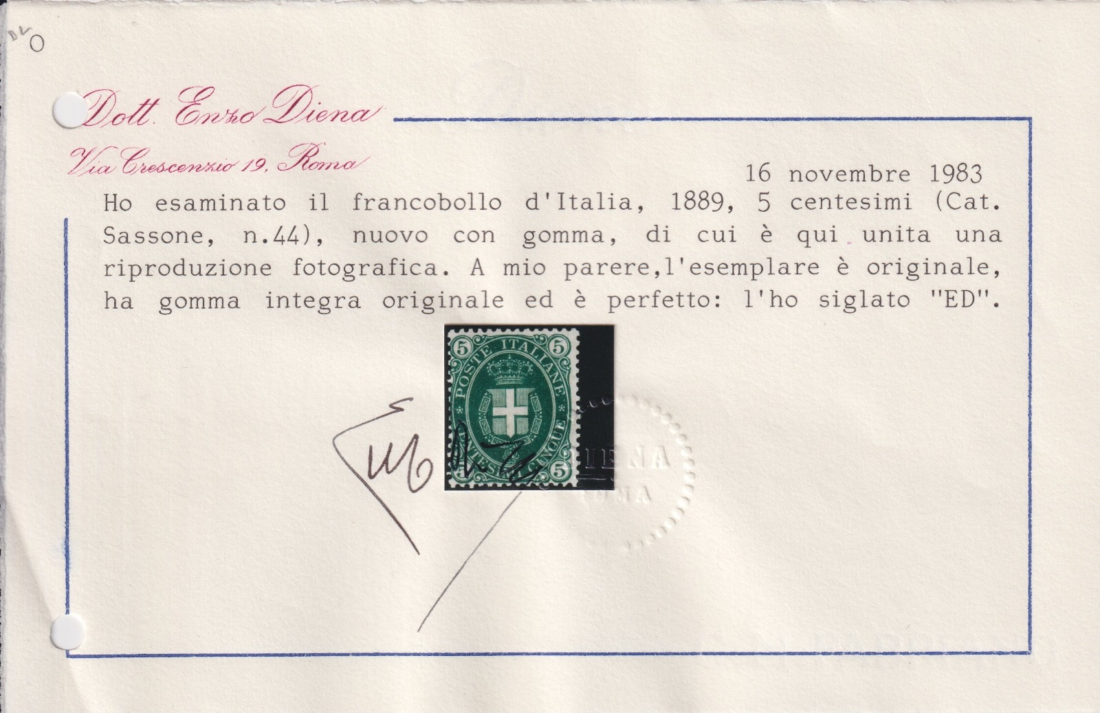 REGNO D’ITALIA 1889 STEMMA DI SAVOIA CENT 5 MNH CERTIFICATO DIENA