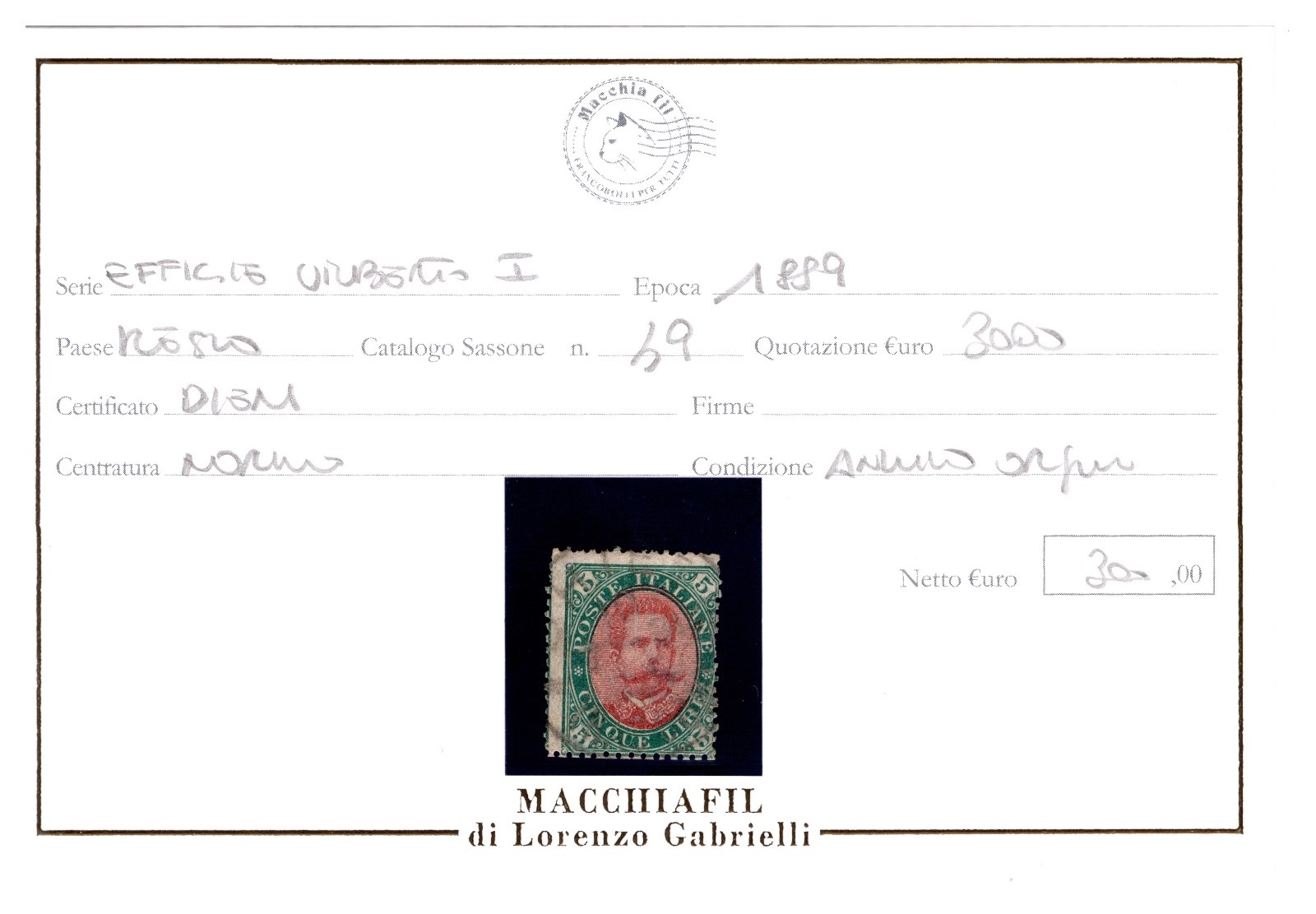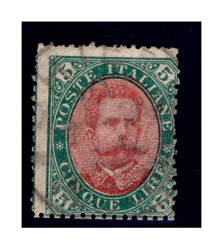 REGNO D'ITALIA 1889 UMBERTO I LIRE 5 VERDE E CARMINIO ANNULLO ORIGINALE CERTIFIC quantità