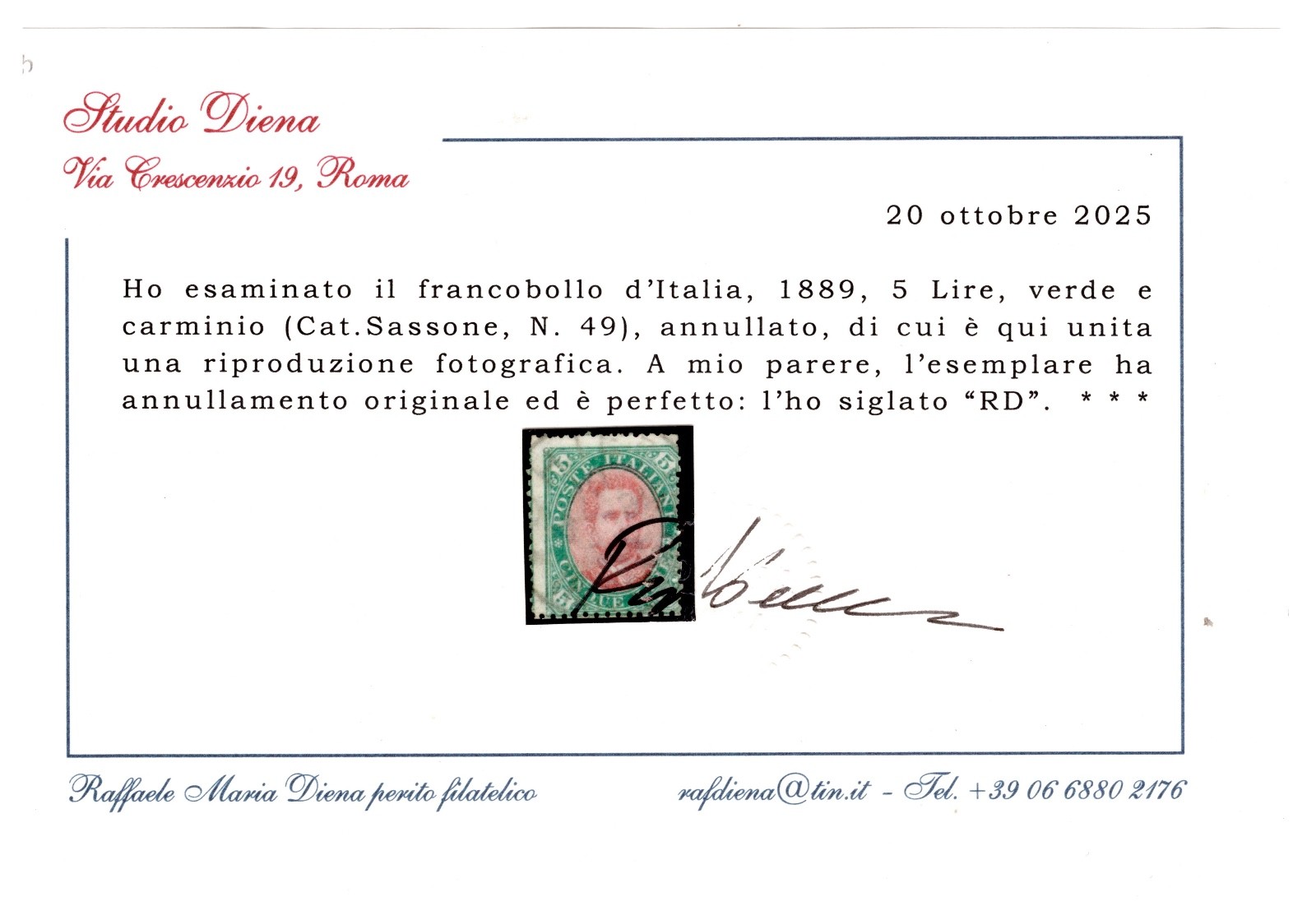REGNO D’ITALIA 1889 UMBERTO I LIRE 5 VERDE E CARMINIO ANNULLO ORIGINALE CERTIFIC