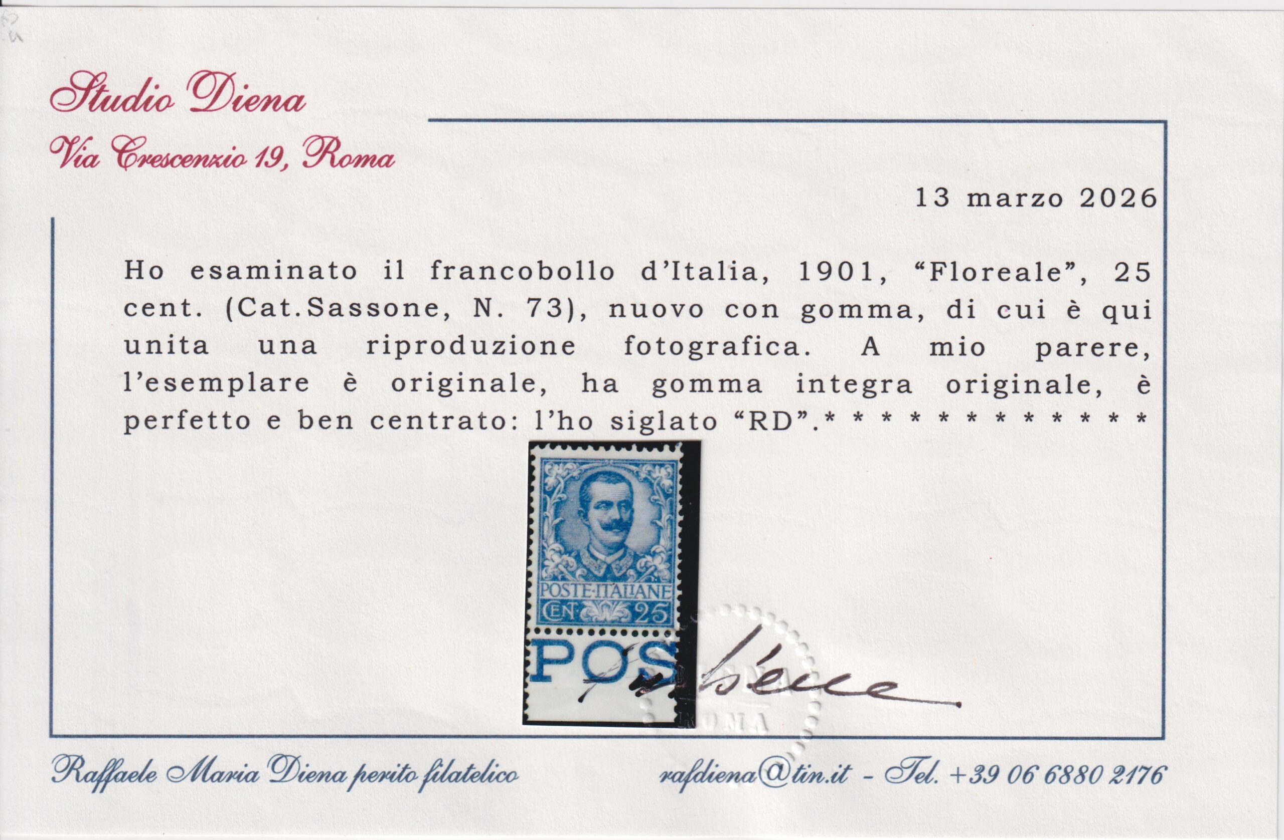 REGNO D’ITALIA 1901 FLOREALE 25c. M.N.H. CERT. DIENA