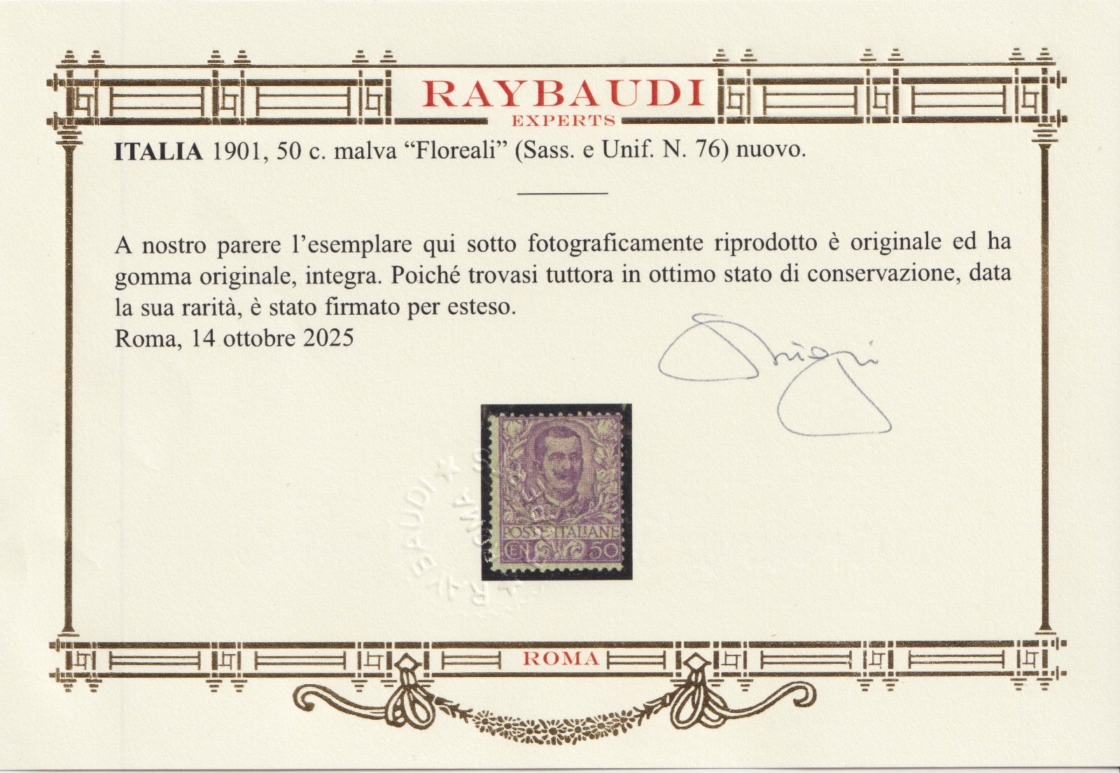 / Regno D’italia 1901 malva “Floreale ” 50c. MNH CERTIFICATI ORO RAYBAUDI