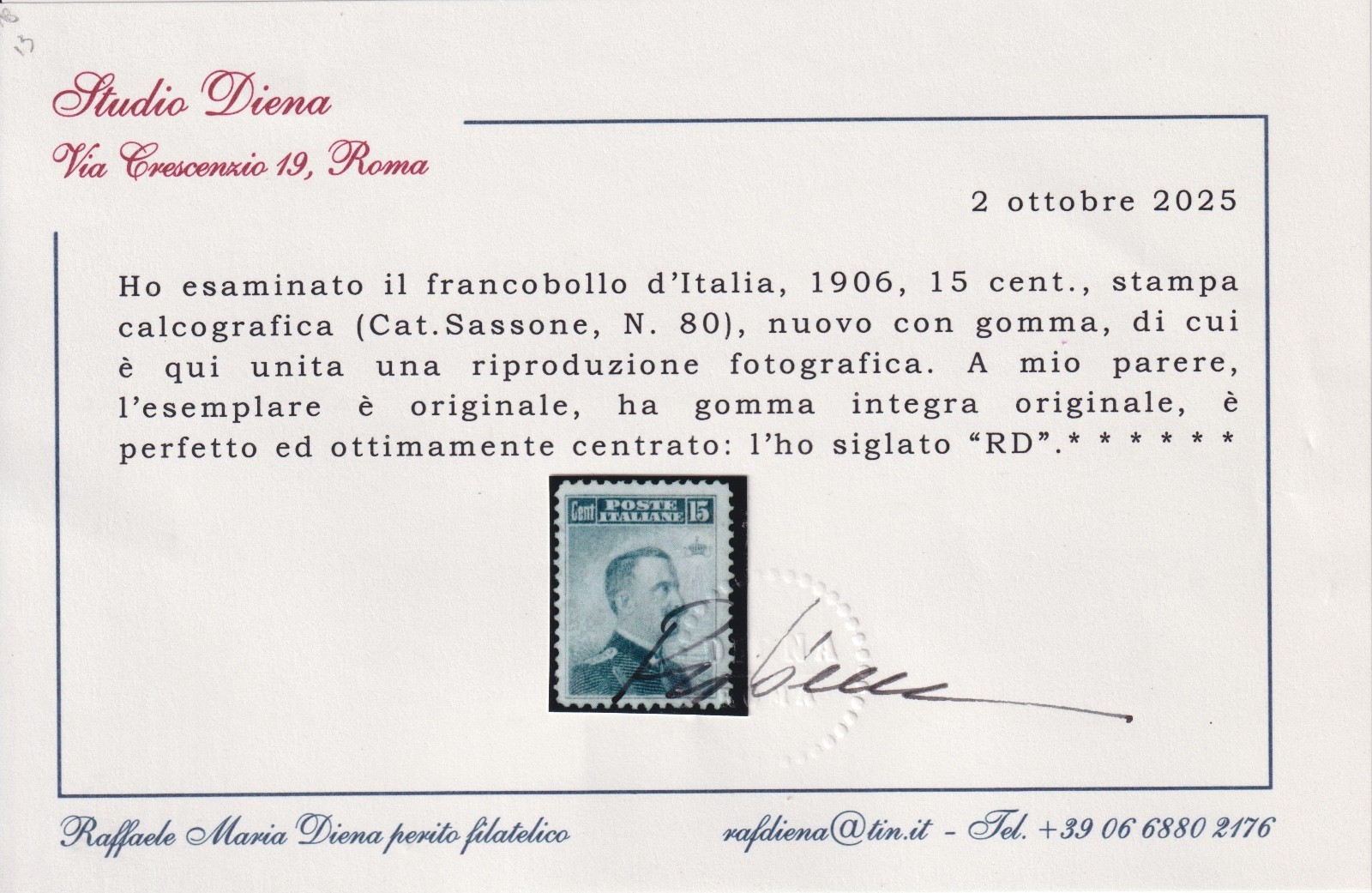 REGNO D’ITALIA 1906 MICHETTI 15 CENT. N.80 MNH CERTIFICATO DIENA