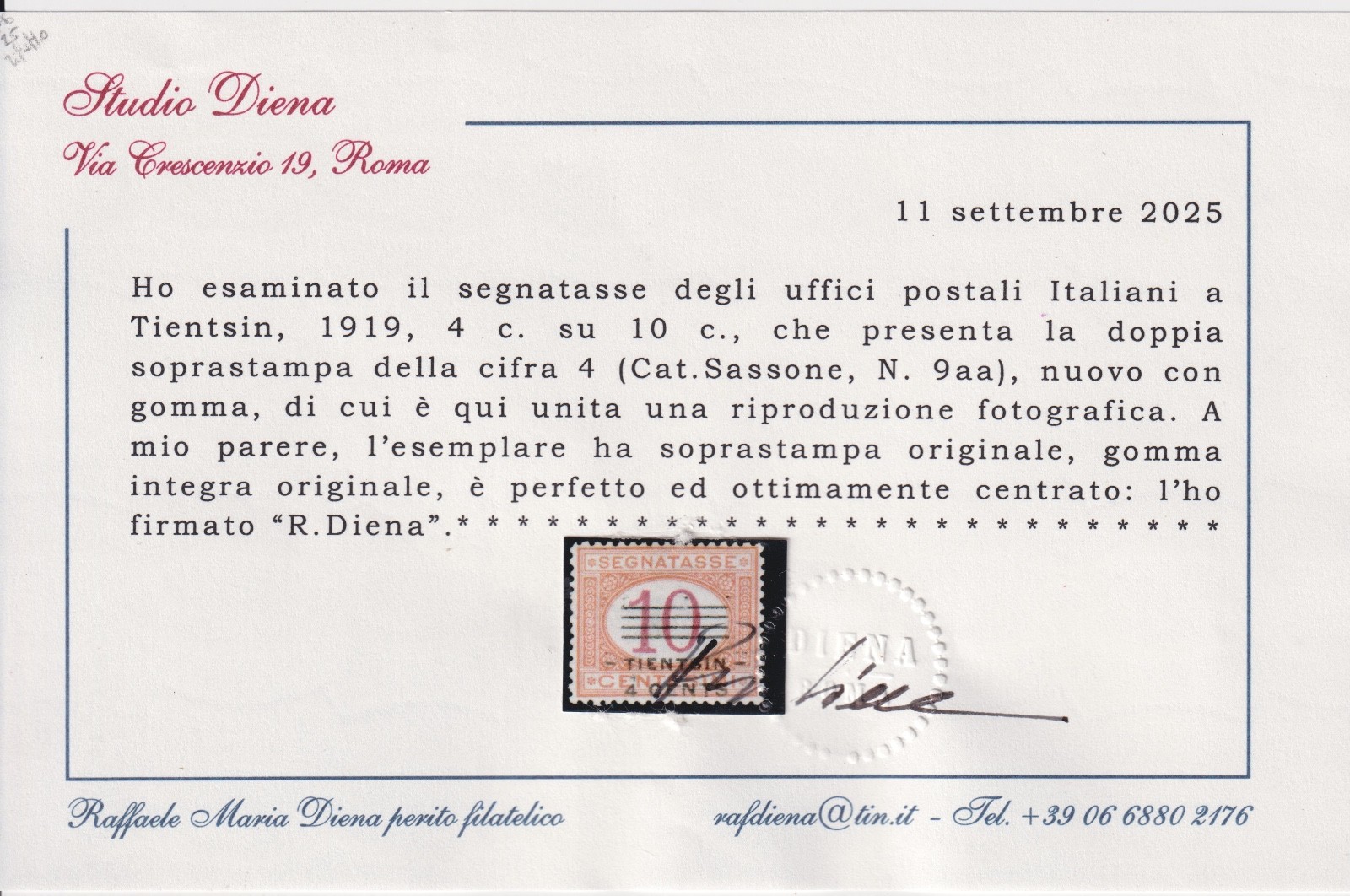 / REGNO D’ITALIA 1919 SEGNATASSE TIENTSIN 4C. SU 10C. MNH CERT. DIENA