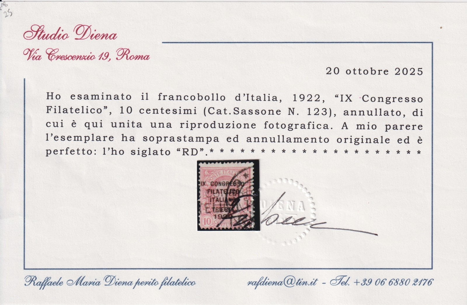 / REGNO D’ITALIA 1922 IX CONGRESSO FILATELICO TRIESTE 10 C. CERT. DIENA