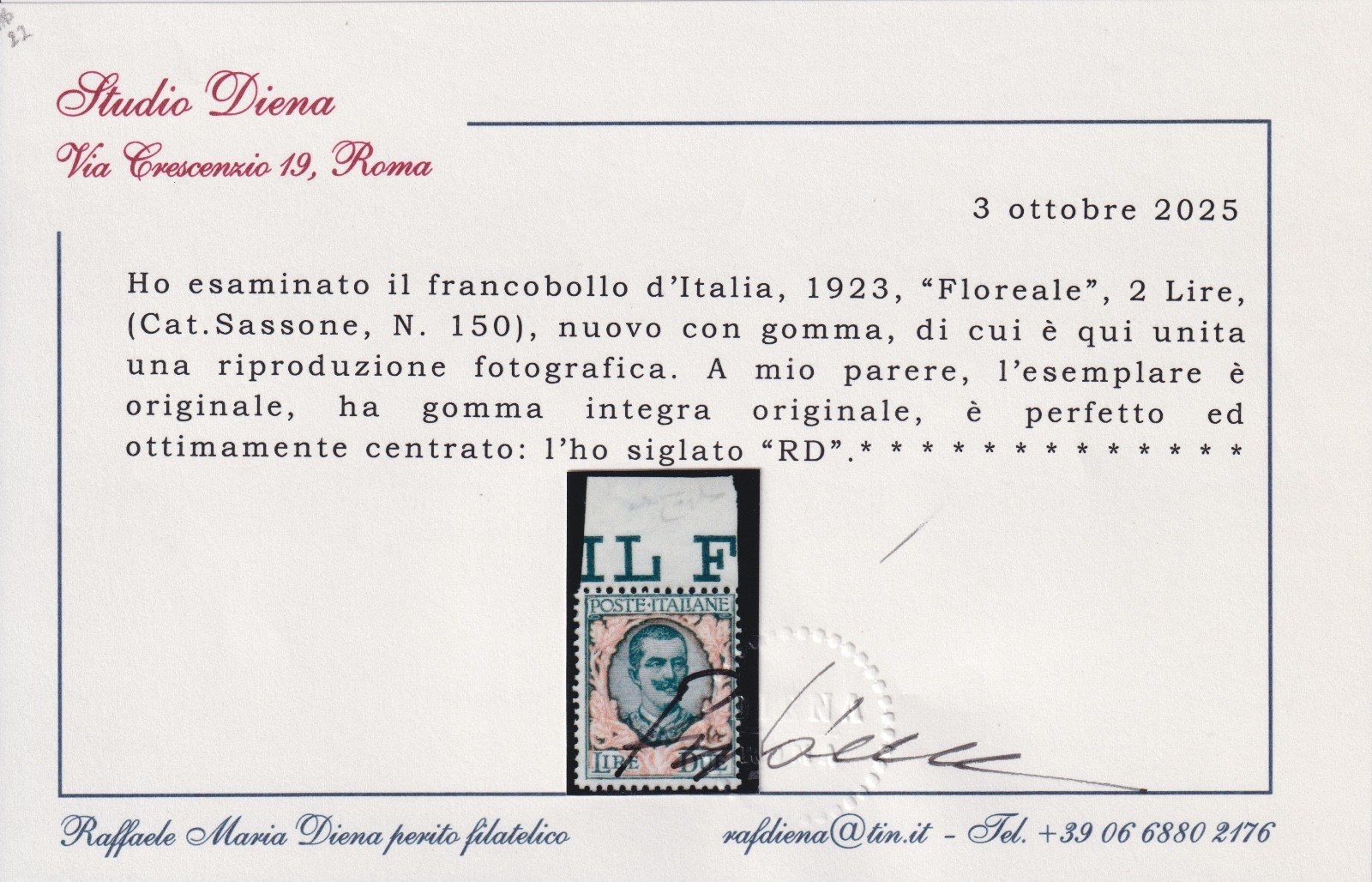 REGNO D'ITALIA 1923 FLOREALE LIRE 2 B.D.F. MNH CERTIFICATO DIENA quantità