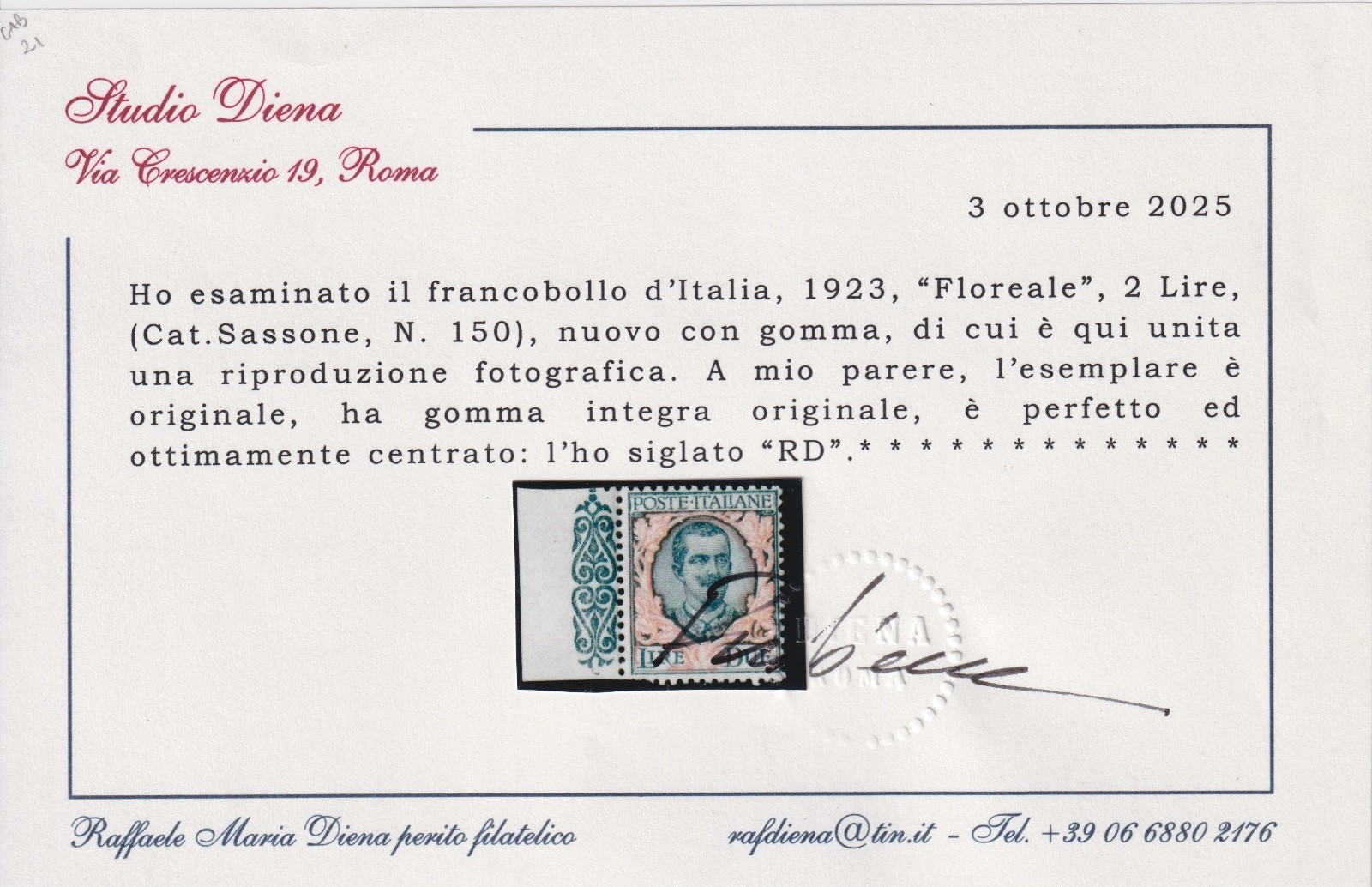 REGNO D'ITALIA 1923 FLOREALE LIRE 2 B.D.F. MNH CERTIFICATO DIENA quantità