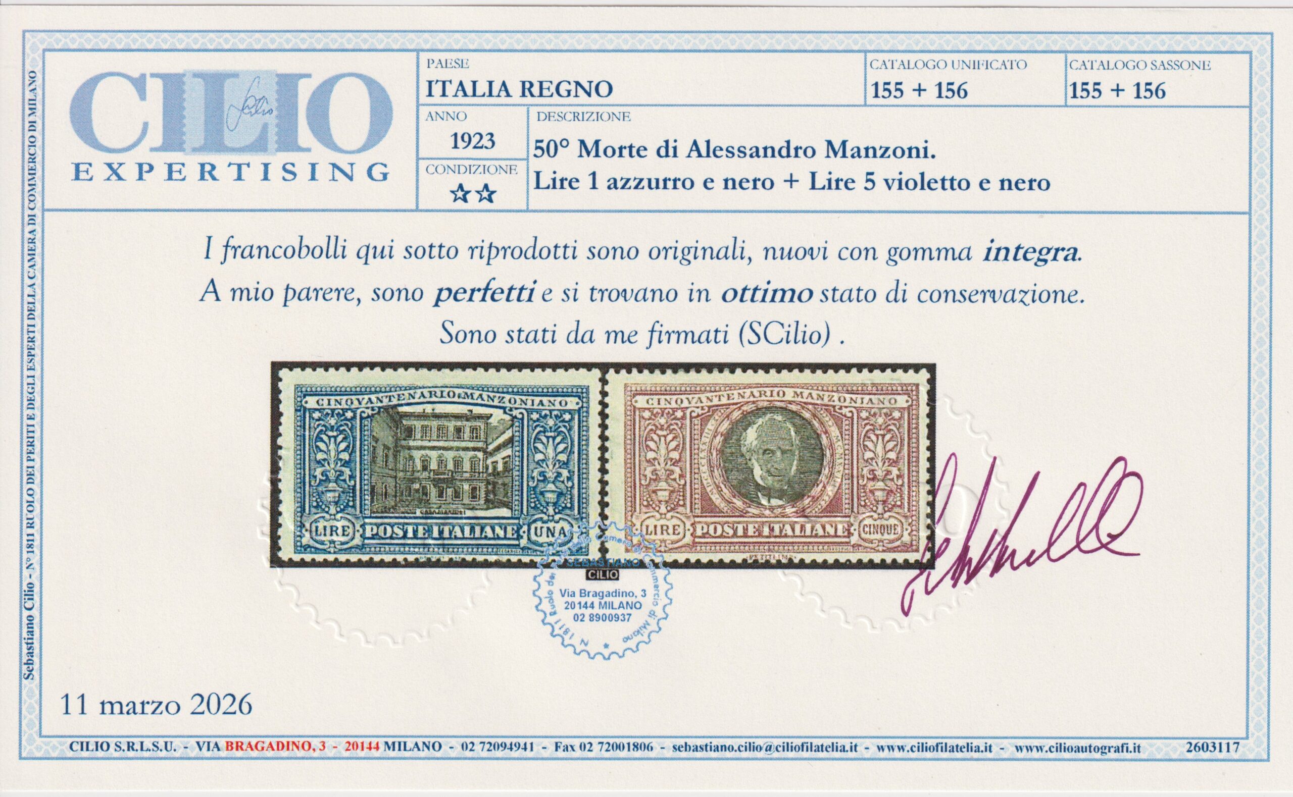 REGNO D’ITALIA 1923 MANZONI M.N.H. CERT. CILIO