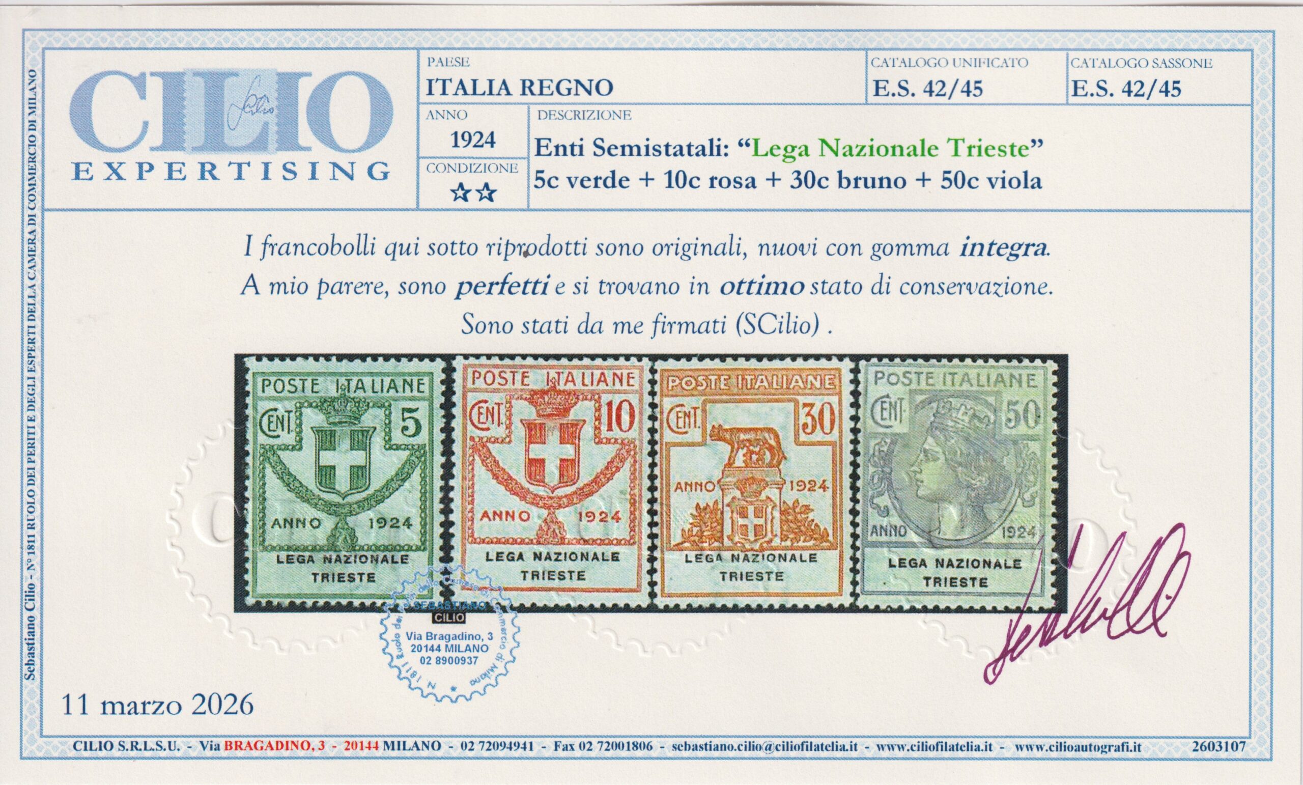 REGNO D’ITALIA 1924 LEGA NAZIONALE TRIESTE M.N.H. CERT. CILIO