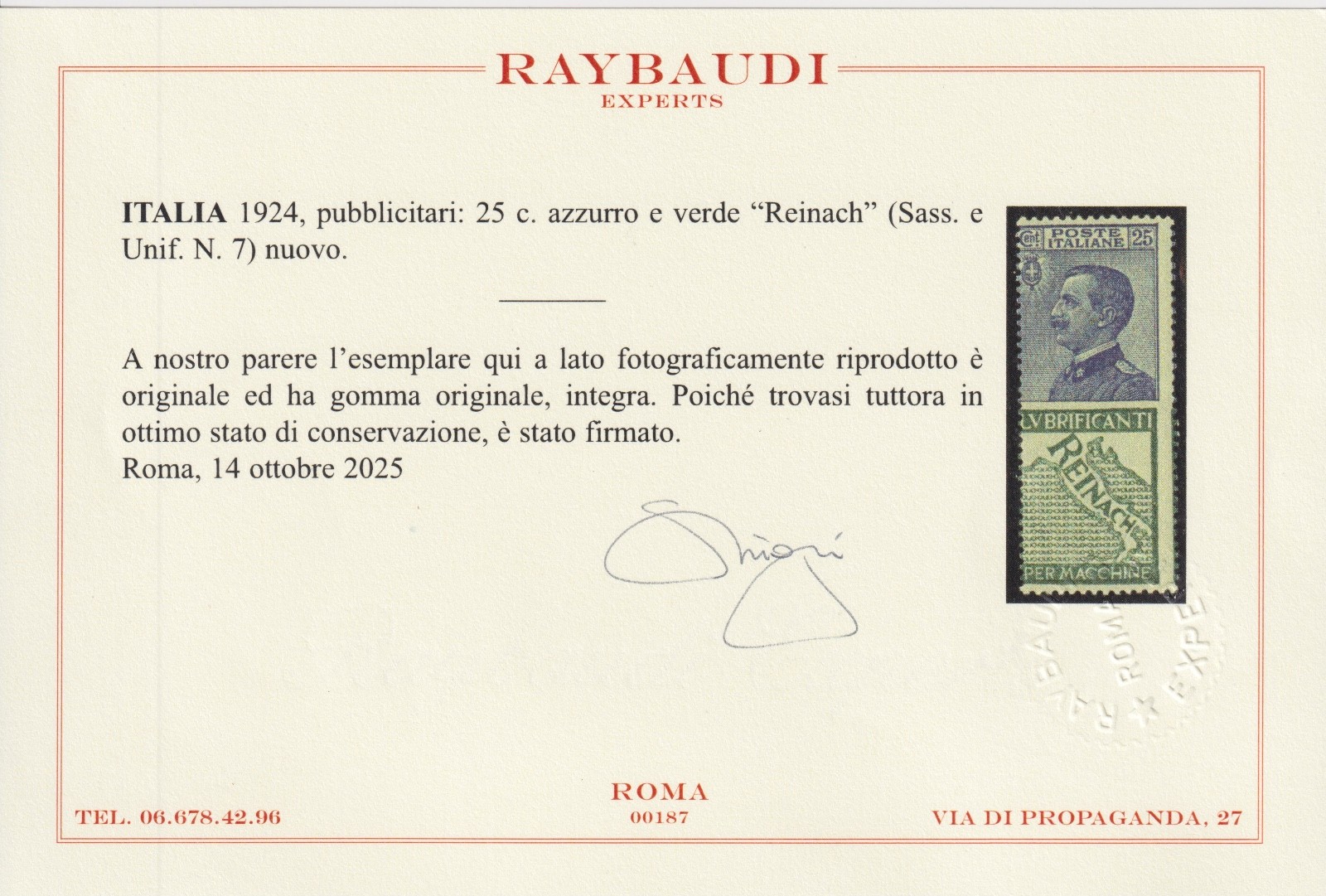 REGNO D'ITALIA 1924 REINACH PUBBLICITARIO CENT 25 MNH CERT. RAYBAUDI quantità