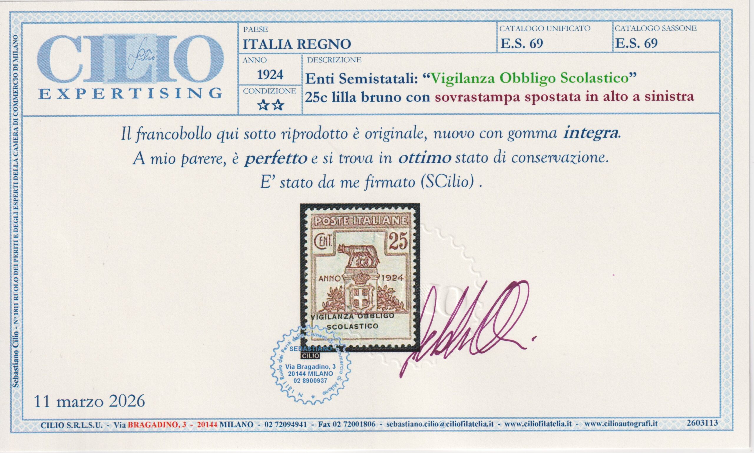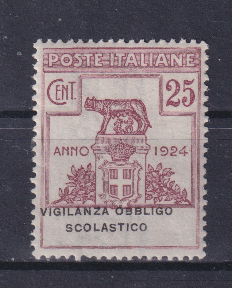 REGNO D’ITALIA 1924 VIGILANZA OBBLIGO SCOLASTICO VARIETÀ M.N.H. CERT. CILIO