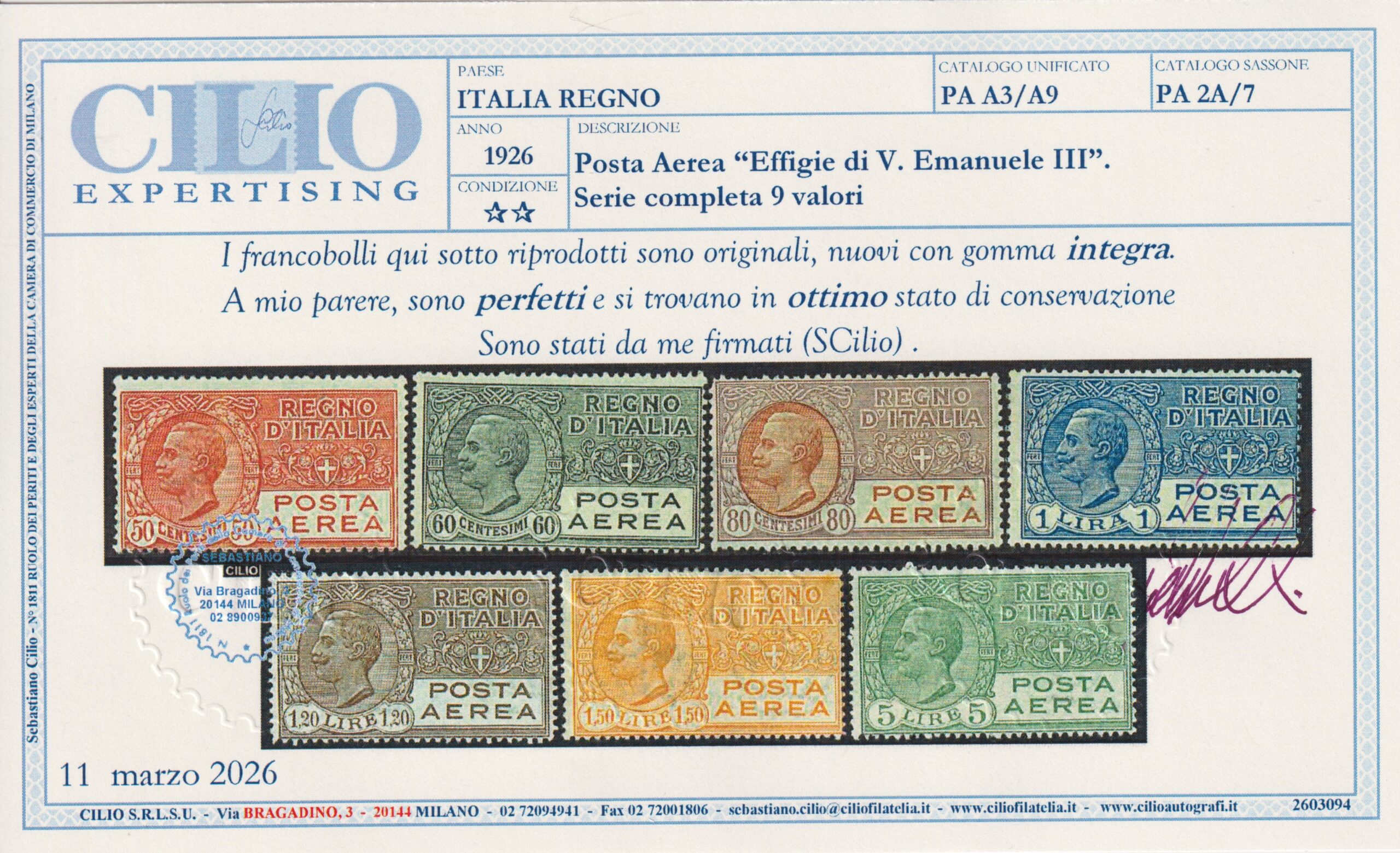 REGNO D'ITALIA 1926 P.A. "Effigie V. Emanuele III" M.N.H. CERT. CILIO quantità