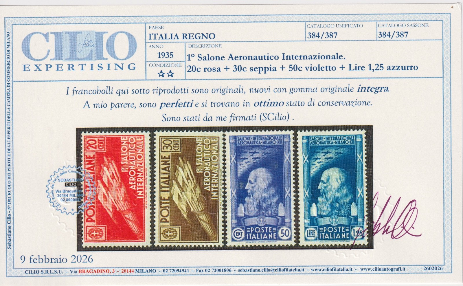 REGNO D'ITALIA 1935 1° SALONE AERONAUTICO 4VAL. MNH CERT. CILIO quantità