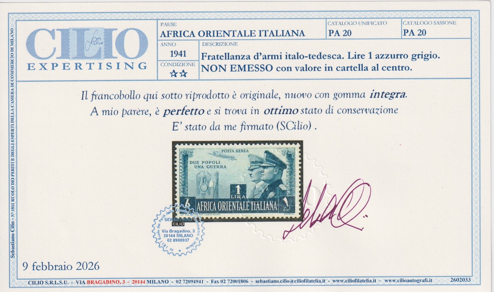 AFRICA ORIENTALE ITALIANA PA NUMERO 20 MNH CERT. COLLA
