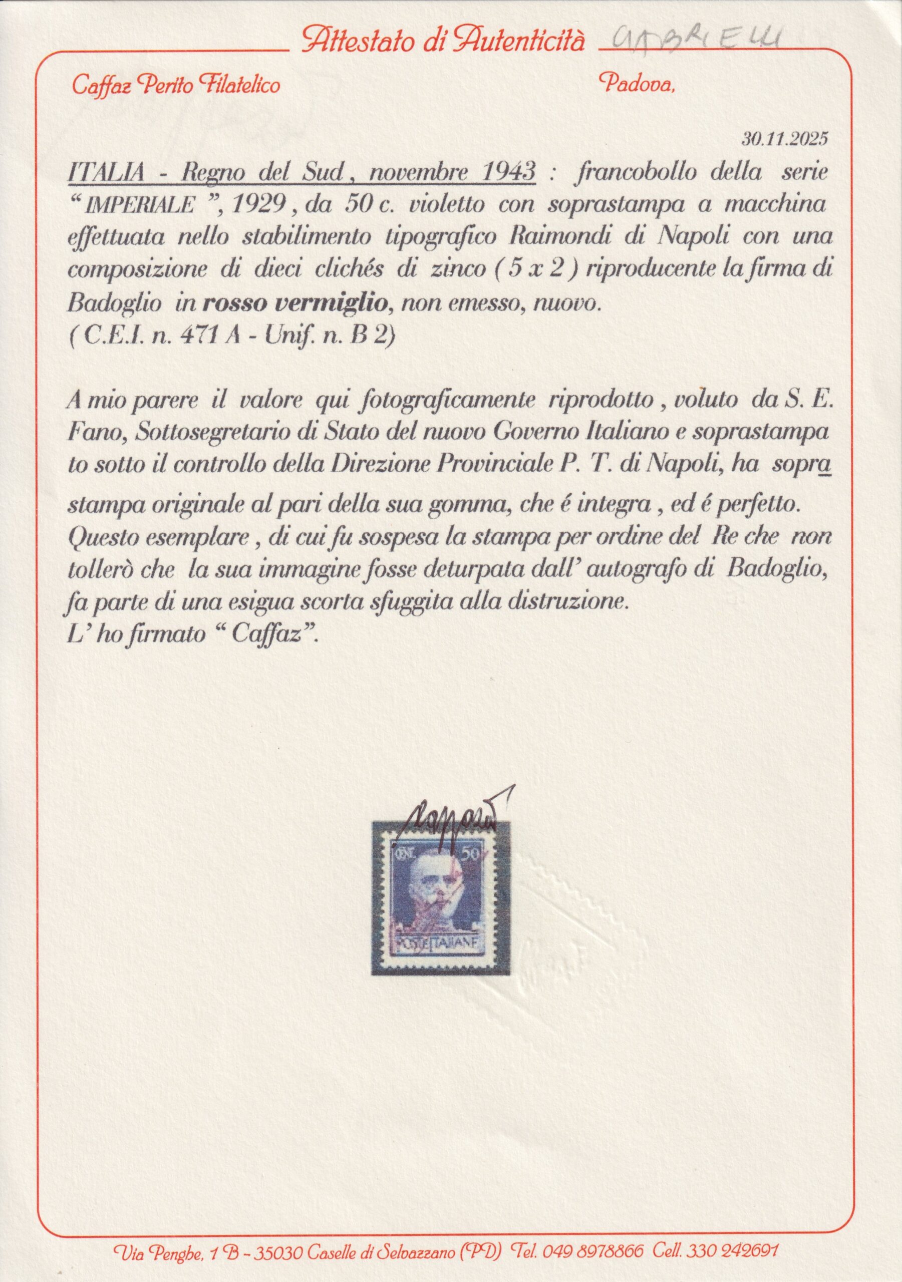 / REGNO D’ITALIA 1943 BADOGLIO VIOLETTO M.N.H. CERT. CAFFAZ