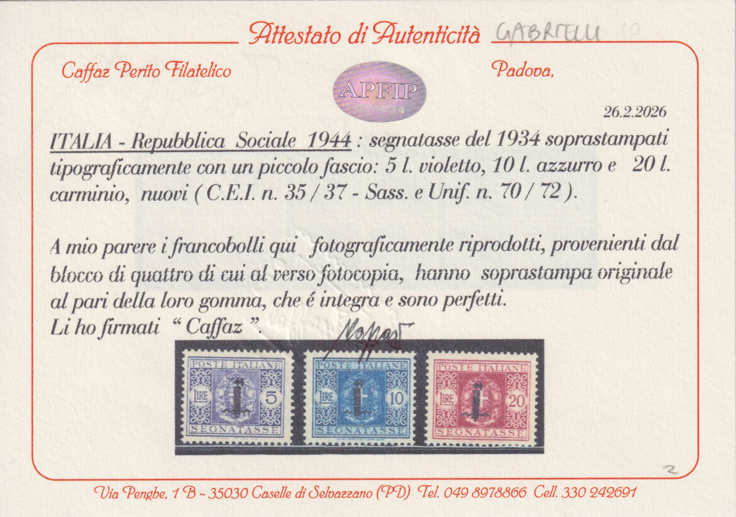 REGNO D'ITALIA 1944 SEGNATASSE FASCETTO M.N.H. CERT. CAFFAZ quantità